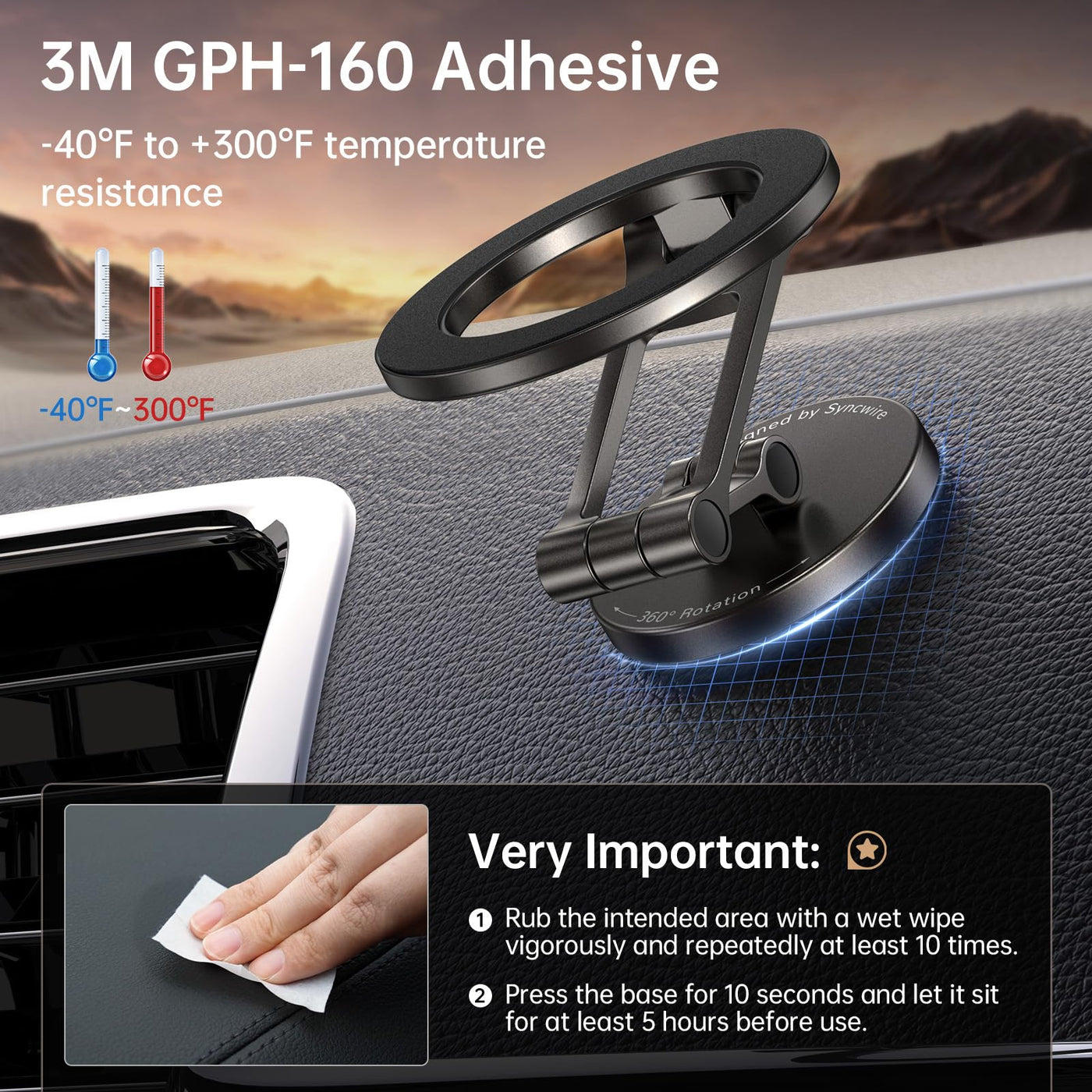 Q: What type of adhesive does the Syncwire car mount use, and how does it perform in extreme temperatures?A: The Syncwire MagSafe Car Mount uses genuine 3M GPH-160 adhesive, providing excellent stability and durability. It maintains adhesion in extreme temperatures ranging from -40°F to +300°F, ensuring it stays securely mounted in various environmental conditions.
