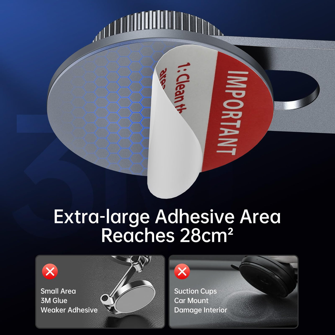 Q: How does the adhesive work and how long does it last?A: The phone holder uses a genuine 3M GPH-160 adhesive that can maintain its strong grip in extreme temperatures ranging from -40°F to +300°F. To ensure maximum adhesion, press firmly for 10 seconds and allow the adhesive to set for a minimum of 5 hours before use.