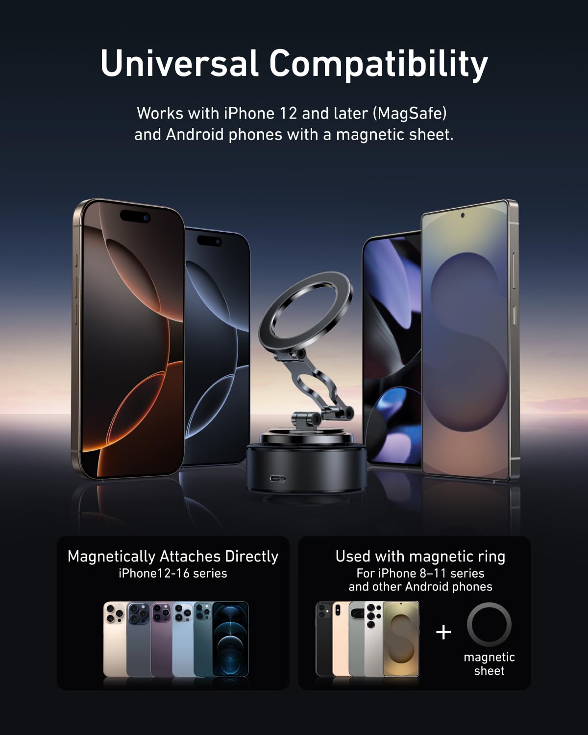 Telesin Electric Magsafe Car Mount Vacuum Magnetic Car Phone Holder 105N 360 Reinforced Adjustable Swivel Lock, Suction Cup Phon