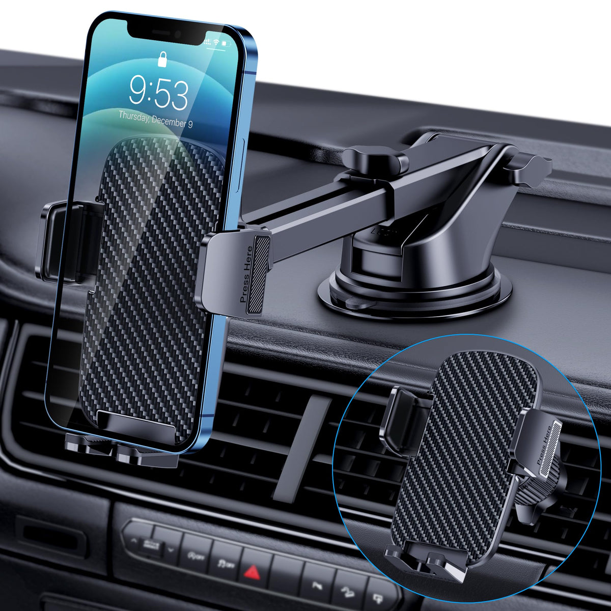 3 In 1 Car Phone Mount: Car Phone Holder Is Equipped With A Strong Sticky Rotating Suction Cup And A Upgraded Vent Clip, Which Can Be Freely Mounted On The Dashboard, Windshield And Air Vent. Suitable For Most Cars, Pickup Trucks, Suvs, Trucks And Taxis. A Good Helper For Uber And Lyft Drivers. | Adhesive Suction Cup: Car Phone Holder Mount With Upgraded Super Sticky Suction And Double Lock Design, Which Doesn'T Come Off Even On Bumpy Roads. An Additional 3M Dashboard Pad Provides A Smooth Surface, And The Car Phone Mount Can Be Securely Mounted Anywhere You Want. Note: Not Recommended To Use The Dashboard Pad For Windshield Mounting. | Flexible Adjustment: Car Phone Mount With A Telescopic Arm Extends From 3.7 Inches To 5.9 Inches And Can Be Adjusted To Any Angle. The Phone Holder Features A Highly Flexible Ball Joint 360 Rotation For Unlimited Viewing Angles. Enjoy A More Relaxed And Safer Driving Experience. | Extra Protection: Cell Phone Car Holder Equipped With A Thick Silicone Panel And Adjustable Bottom Tray Provides All-Around Protection To Keep Your Phone From Scratches And Drops. | Universal Compatibility: Phone Holder Car Adopts A One-Button Release System. Quickly Release Your Phone With One Hand. Completely Free Your Hands And Enjoy Your Safe Driving. The Adjustable Clip Arm Is Perfect For 4.0-7.1 Inch Phones.