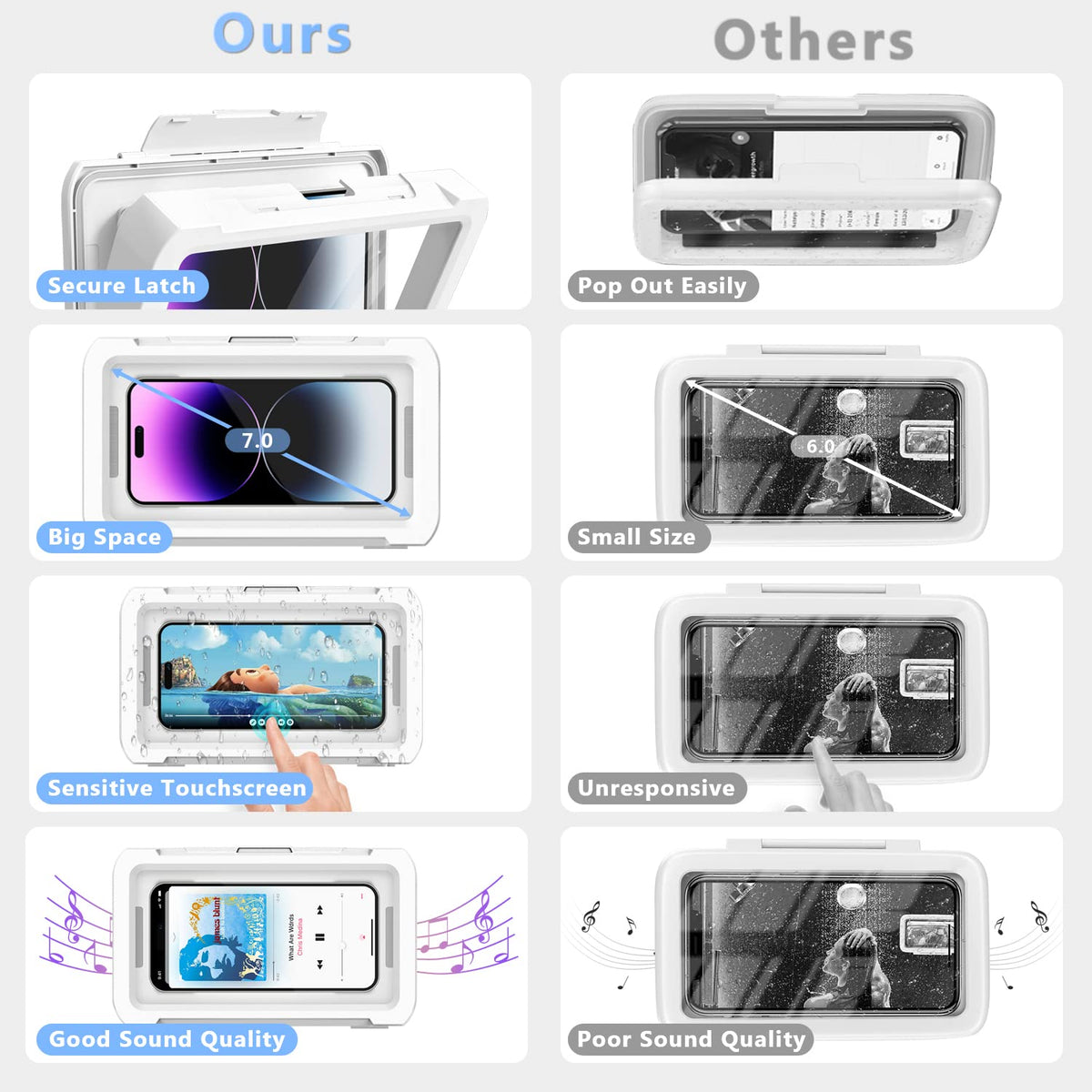 ?Compatibility Upgrade? Our New Bathroom Waterproof Phone Case Can Fit Phones Up To 7 Inches, And Even Accommodates Thicker Phone Cases That The Previous Version Could Not. | ?Unbeatable Waterproof Protection? This Case Is Designed To Provide All-Around Protection For Your Phone, Ensuring That It Stays Dry And Secure No Matter What. | ?Versatile Usage? With This Waterproof Phone Case, You Can Easily Enjoy Your Phone In The Bathroom Without Worrying About Water Damage. It'S Perfect For Anyone Who Wants To Stay Connected While Enjoying Some Downtime, Or For Busy Professionals Who Don'T Want To Miss Important Calls Or Emails. It'S Also A Great Tool For Parents Who Want To Keep Their Kids Entertained While They Bathe. | ?Easy Installation? Our Phone Case Comes With A Super Adhesive Backing That Makes It Easy To Install On Various Surfaces, Including Glass, Mirrors, Ceramic Tiles, And Other Smooth And Flat Walls. Additionally, We Provide 3 Adhesive Backings That Can Be Used In Different Positions. | ?Universal Large Size? This Waterproof Phone Case Can Accommodate Smartphones Up To 7 Inches In Size, Including But Not Limited To The Iphone 15,15Plus, 15Pro, 15Pro Max, Iphone 14 Pro Max/13/12 Pro Max/12, 11 Pro Max/11, 6/6S/7/8 Plus, X/Xs Max/Xr, Galaxy S23 Ultra/S23 Plus, S22 Ultra/S22, S21/21 Ultra, S9/9+, S10/10 Plus, Note 8/9/10/10+/10/20/20 Ultra, A72/F62, Z Fold 2/3, Pixel 6Pro/5/4, Lg G7/G8, Oneplus 8/9 Pro, Motorola, Nokia, And More.