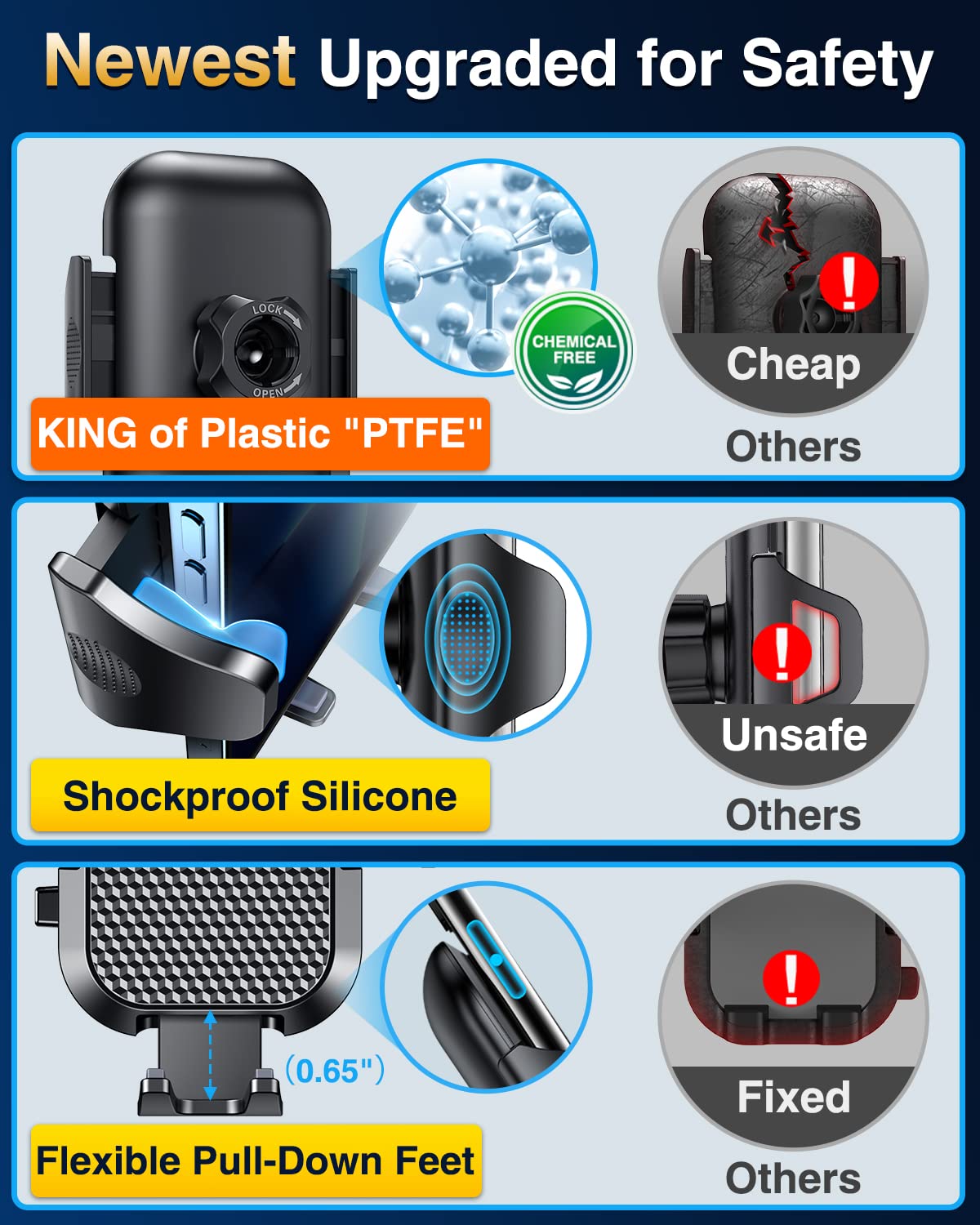 The Dash-Mounted Holder Allows You To Drive Effortlessly By Easy Operation Secure Mountingstrong Sticky Suction With Secure Locking Mechanism Ensures Snug Fit For Most Surfaces Easy To Restore The Sticky Gel By Rinsing With Water Optimal Viewing The Car Mount Holder Is Fully Adjustable To Gain Optimal Viewing With Its 360-Degree Rotation Ball And Adjustable Two-Section Neck Between The Base And The 360Arotation Ball High-Quality Structurethe Stability Of The Mount On The Dashboard Relies Both On The Super Suction Cup And The Specially Designed Structure To Reduce The Whole Force Moment All Car Phone Holders Are Over 100 Times Of Dropping Test, High & Low-Temperature Test, Loading Test, Pulling Test And Vibration Test Simple Installation And Removaladjust The Desired Length And Angle Of The Telescopic Arm Fully Rotate To The Lock Icon To To Lock The Mount In Place Wide Compatibility 40 - 67 Wide And Over 078 Deep Locking Range Allows Large Phones With Thick Phone Case Package Included: Car Phone Mount A1 Suction Cup A1 Air Vent Clip X 1User Manuala1