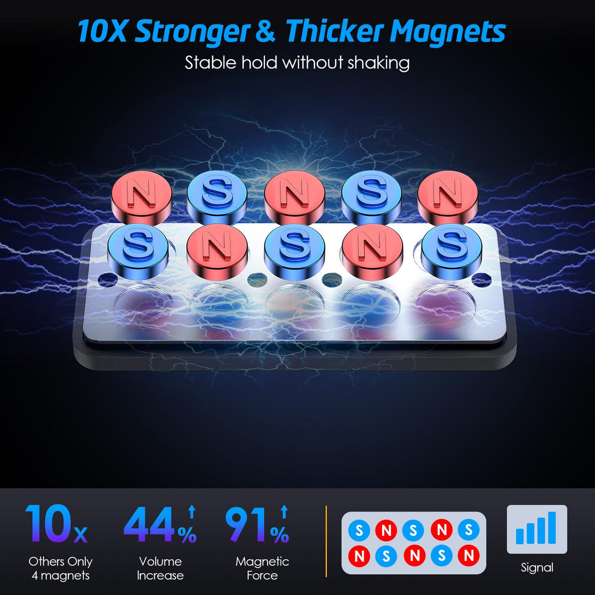 Q: How strong is the magnetic hold of the WixGear Magnetic Phone Car Mount?A: The WixGear Magnetic Phone Car Mount features 10 super strong magnets that securely hold smartphones of any size, ensuring your device stays in place even on bumpy roads.