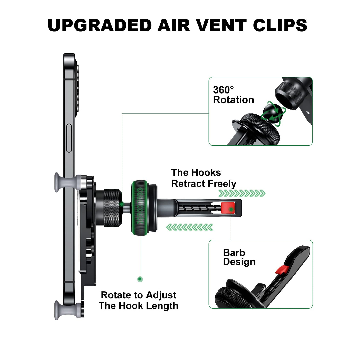 Q: Does this mount allow for multiple viewing angles?A: Yes, the car mount features fully adjustable ball joints that enable 360° rotation, allowing you to set your phone at the perfect angle for navigation, video calls, or charging.