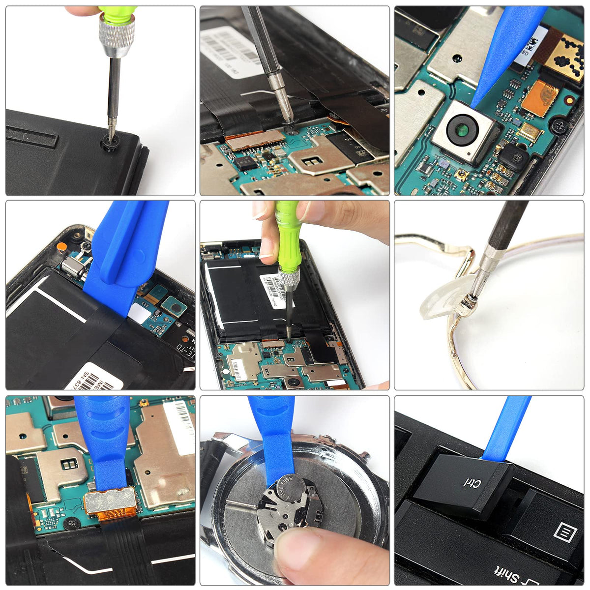 Q: What is included in the 13 Pcs Precision Screwdriver Set?A: The set includes 7 precision screwdrivers, an opening LCD screen suction cup plier, 2 replacement suction cups, and 3 anti-static plastic pry bars, providing a comprehensive toolkit for various repair tasks.