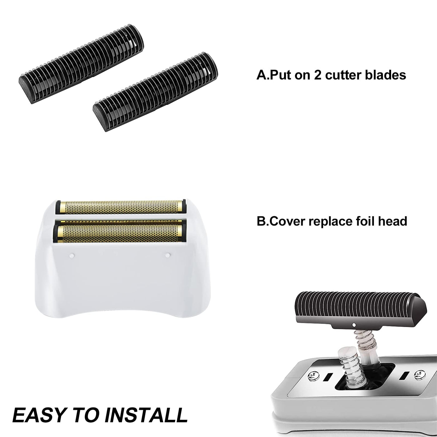 Q: How do I properly install the replacement foil and cutters?A: To install the replacement foil and cutters, carefully remove the old assembly from your shaver. Align the new foil and cutters with the provided slots and press down gently until securely in place. Refer to the instructions on the back of the package for detailed guidance.