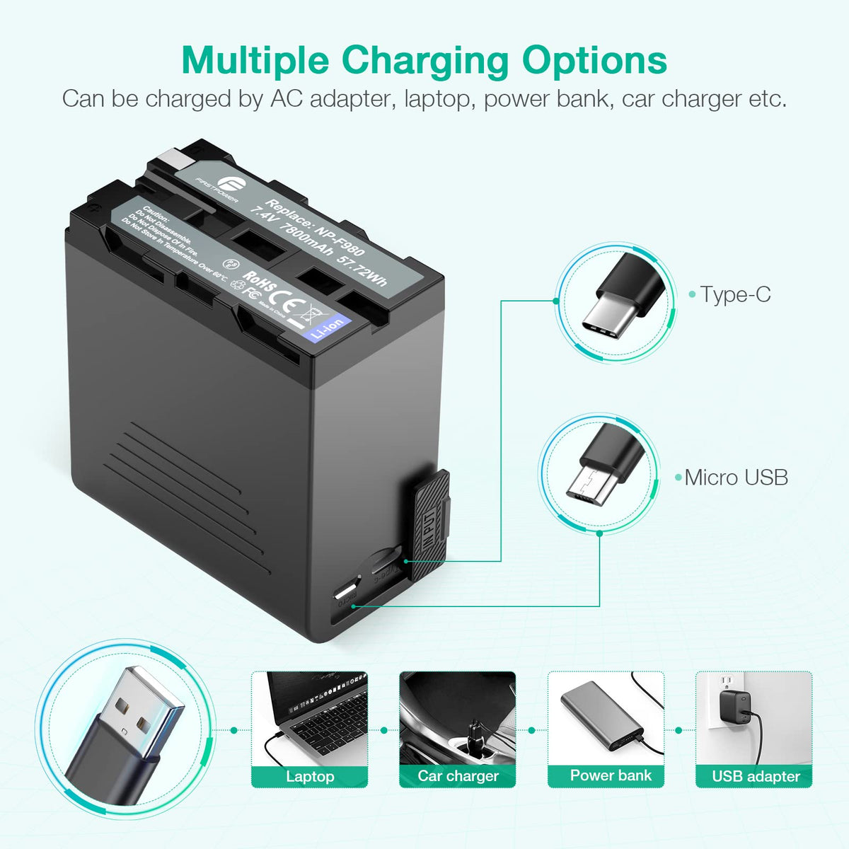 Q: Can I charge the FirstPower NP-F970 Battery using a USB cable?A: Yes, the FirstPower NP-F970 Battery can be charged using a Micro-USB or Type-C cable with a 5V/2A USB power source, making it convenient to recharge without needing a dedicated charger.