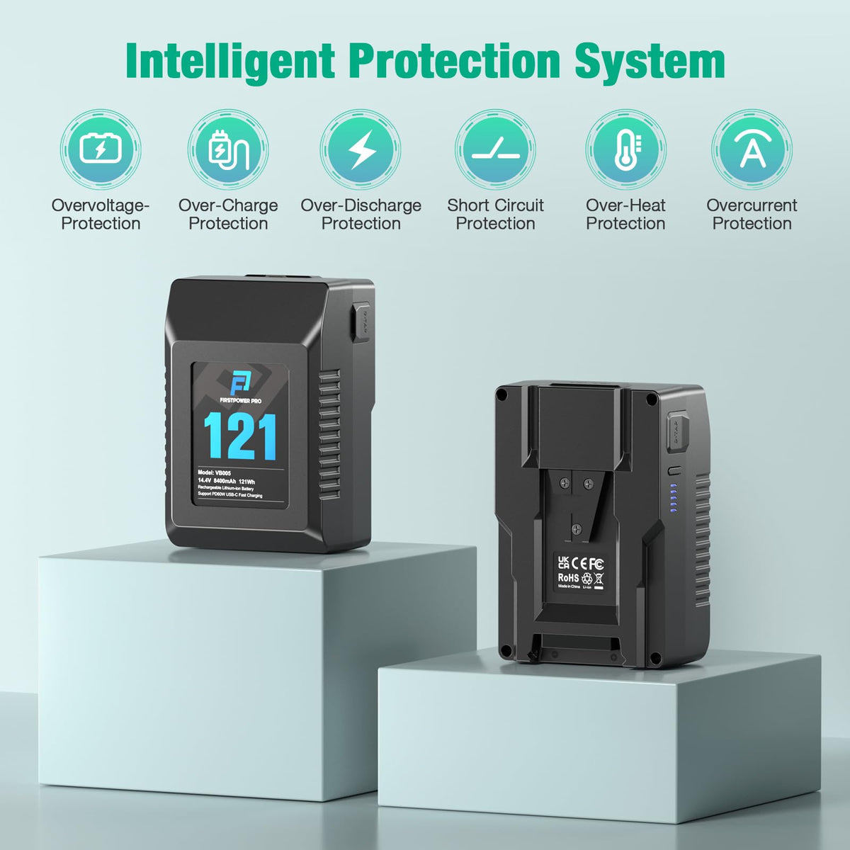 Q: What safety features does the FirstPower V Mount Battery include?A: The FirstPower V Mount Battery has a built-in intelligent protection system that prevents overcharging, overvoltage, overcurrent, and short circuits, ensuring safety and stability during use.