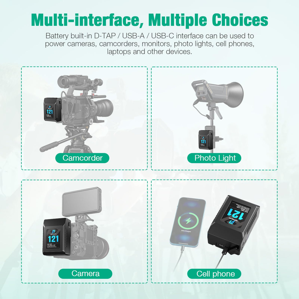 Q: What devices are compatible with the FirstPower V Mount Battery?A: The FirstPower V Mount Battery is compatible with a wide range of devices, including DSLR cameras, camcorders, monitors, LED lights, smartphones, tablets, and laptops, thanks to its multiple interfaces such as dual D-TAP, USB-C, and USB-A ports.