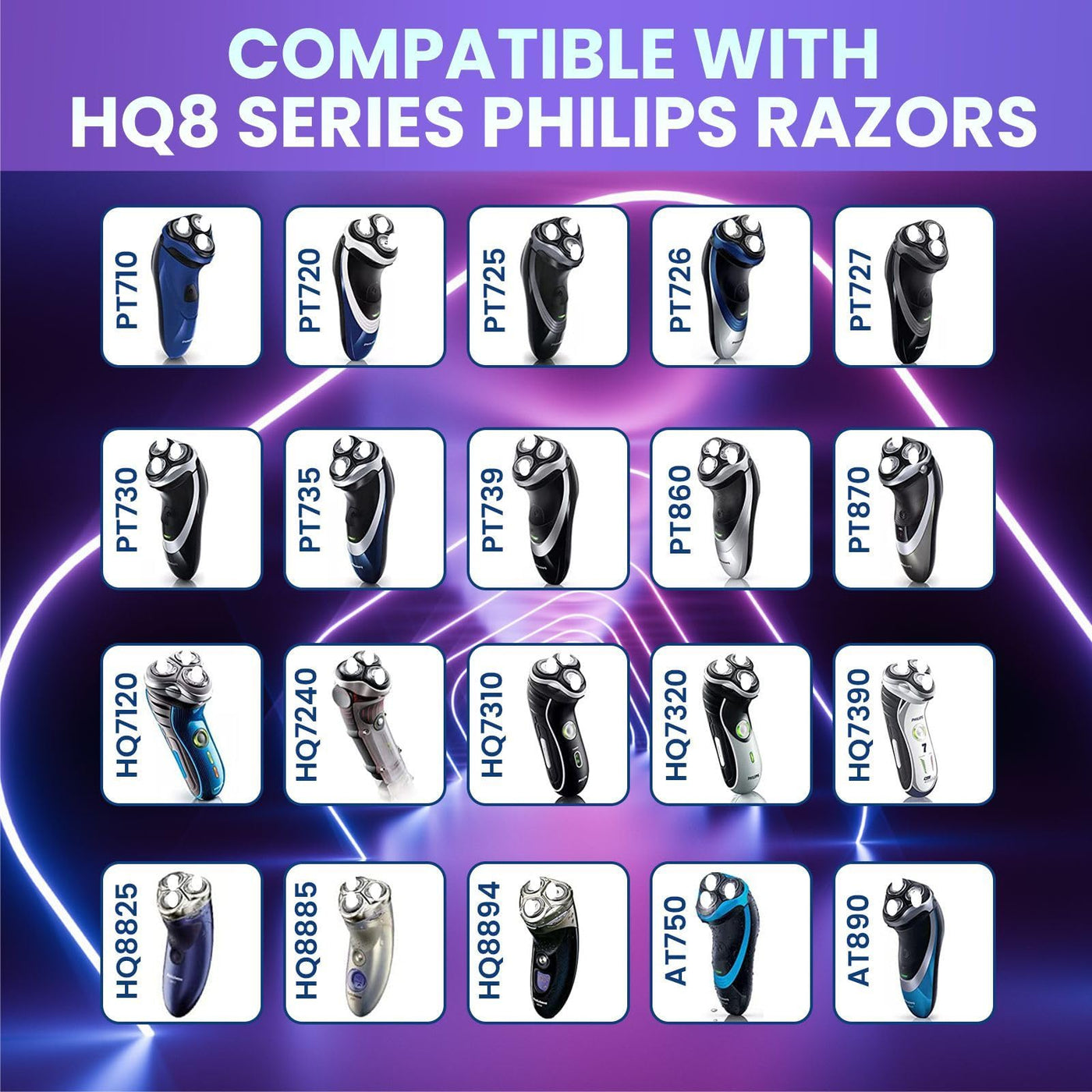 Q: What shaver models are compatible with the HQ8 Replacement Heads?A: The HQ8 Replacement Heads are compatible with various Philips Norelco Aquatec Shaver models, including AT750, AT751, AT890, AT891, PT710, PT715, PT720, PT725, PT730, PT735, PT860, PT870, and the HQ71XX, HQ73XX, and HQ88XX series.