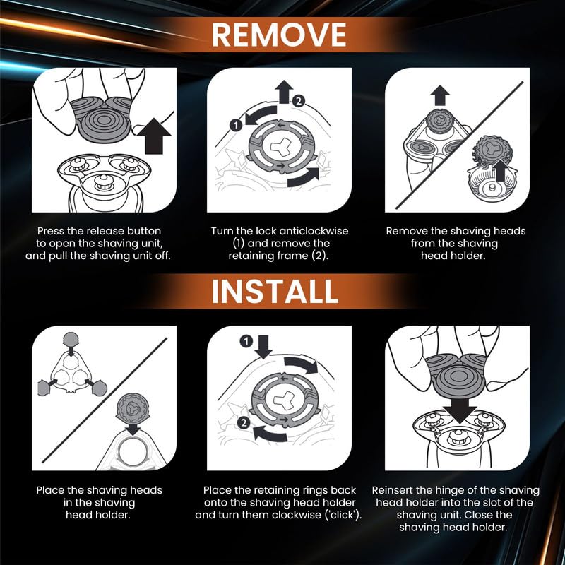 Q: How do I install the SH60 replacement blades?A: Installing the SH60 replacement blades is quick and easy. Just remove the old head and snap on the new one. After installation, apply a drop of oil to each nozzle and run the shaver for 10 seconds for optimal performance.