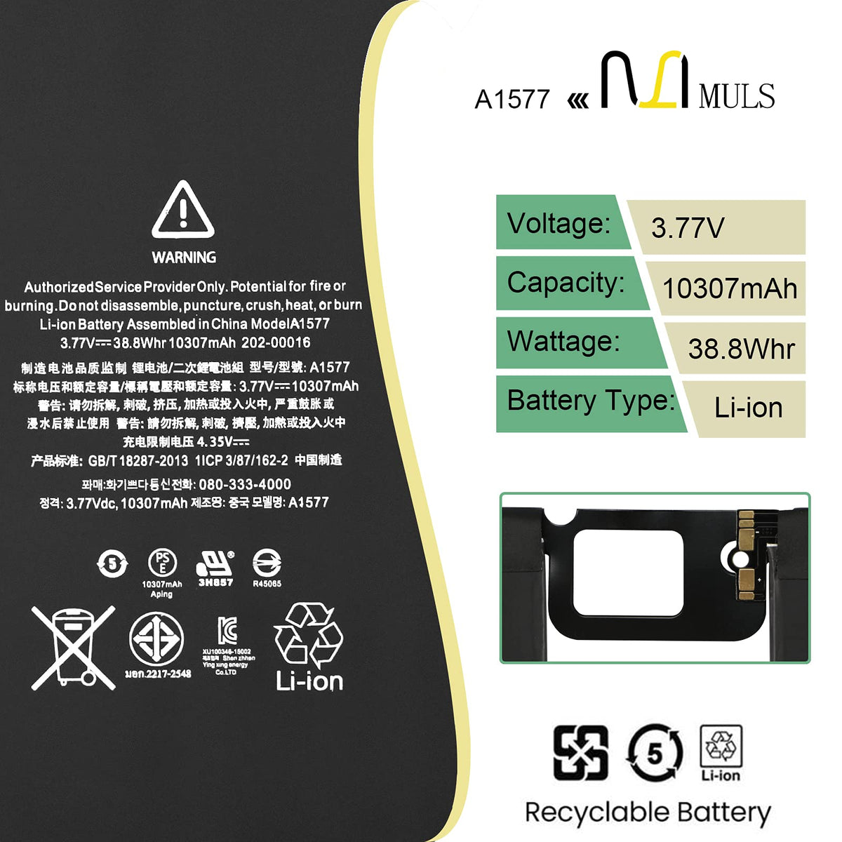 Q: What devices are compatible with the MULS A1577 Tablet Battery?A: The MULS A1577 Tablet Battery is compatible with the Apple iPad Pro 12.9” 1st Generation models, including A1584 and A1652. It fits various model numbers such as ML0F2LL/A, ML0G2LL/A, ML3K2LL/A, and more. Please verify your specific model before purchasing.