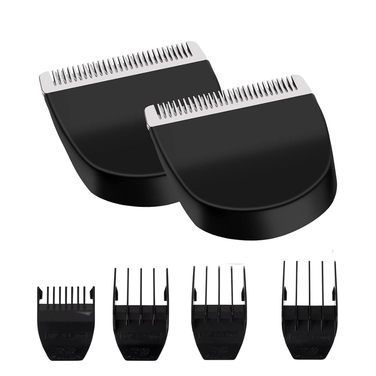 Q: What comes in the package with the replacement blades?A: The package includes 2 Pack Professional Peanut Snap On Clipper/Trimmer Blades in black, along with 4 black attachment comb cutting guides (sizes: 1/8", 1/4", 3/8", 1/2") for added versatility in trimming.