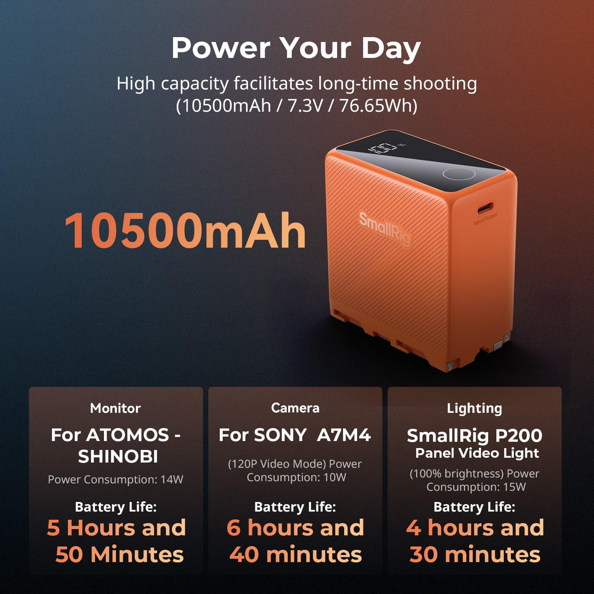 Smallrig Np-F970 Usb-C Rechargeable Camera Battery (Orange) - 4576 Key Features: 1. 10500Mah High Standard Capacity For Long-Lasting Battery Life; 2. Featuring Usb-C Input/Output And Usb-A Output Interfaces, This Battery Serves As A Portable Power Source; 3. The Usb-C Port Supports Pd 36W Fast Charging, Enabling A Quick Full Charge In Just 3.5 Hours; 4. Parallel Circuits Of Usb-C And Usb-A Ports Allow For Simultaneous Fast Charging (Total Power Not Exceeding 54W); 5. Equipped With Touch Buttons And A Battery Level Display Screen, Making It Convenient To Monitor The Precise Remaining Battery Level At Any Time; 6. Colorful Exterior Design, Stylish And Minimalist, Full Of Technological And Trendy Vibes; 7. High-Quality Battery Cells From Reputable Manufacturers, Integrated With Intelligent Management Chips And Equipped With Multiple Protection Features In The Circuit System, Ensure The Safety, Reliability, And Longevity Of The Product. Battery Type:Lithium-Ion Battery Capacity Parameters:10500Mah / 7.3V / 76.65Wh Charging Voltage:8.4V Nominal Voltage:7.27V Usb-C Input/Output:5V / 3A, 9V / 3A, 12V / 3A Usb-C Protocol:Pd3.0 / Qc3.0 / Qc2.0 / Fcp / Afc / Pps Usb-A Output:5V / 3A, 9V / 3A, 12V / 2.25A Usb-A Protocol:Qc3.0 / Qc2.0 / Fcp / Afc Usb-C Overcurrent Protection:=3.5A Usb-A Overcurrent Protection:5V / 9V=3.5A, 12V=2.6A Main Port Max Discharge Current:10A Main Port Over-Discharge Current Protection Threshold:11A Discharge Cut-Off Voltage:5.2V Package Includes: Np-F970 Usb-C Rechargeable Camera Battery X 1 Battery Cover X 1 Usb-C To Usb-C Charging Cable X 1 Product Weight: 379 10.0G / 13.4 0.3Oz Product Dimensions:74.6 X 71.6 X 38.5Mm / 2.9 X 2.8 X 1.5In Package Weight:550 10G / 19.4 0.3Oz Package Dimensions:118 X 116 X 54Mm / 4.64 X 4.56 X 2.12In Material(S): Abs+Pc