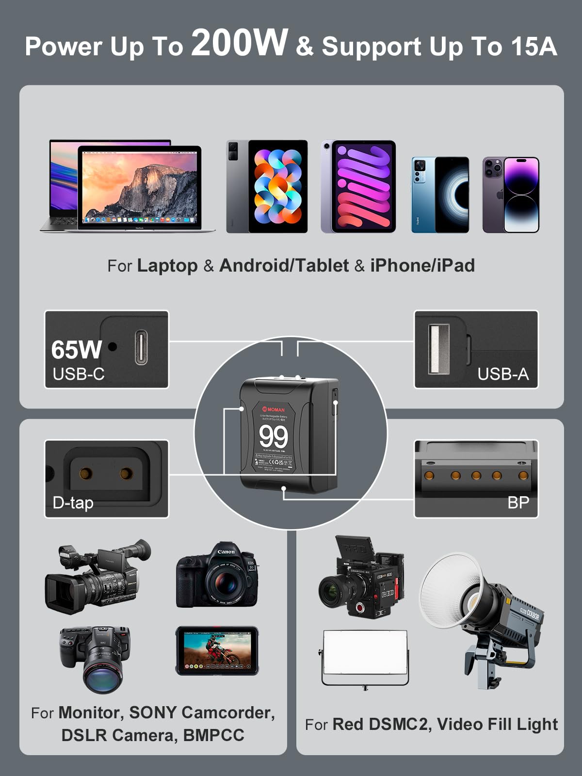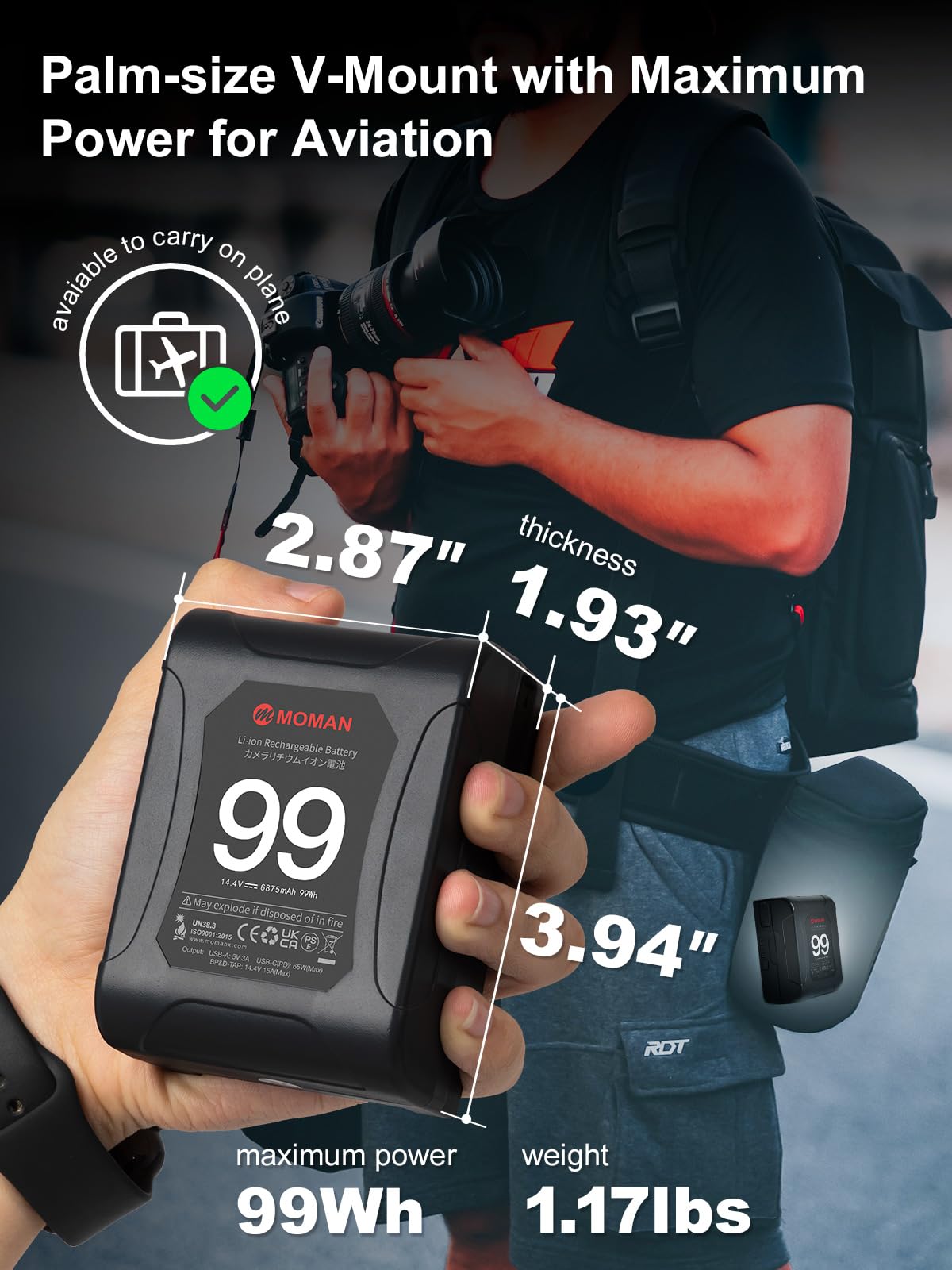 V Mount Battery, Moman Mini V Lock Mount Power 99Wh 15A Up To 200W Draw With Dual D Tap & Usb Outputs For Bmpcc 4K 6K Camcorders