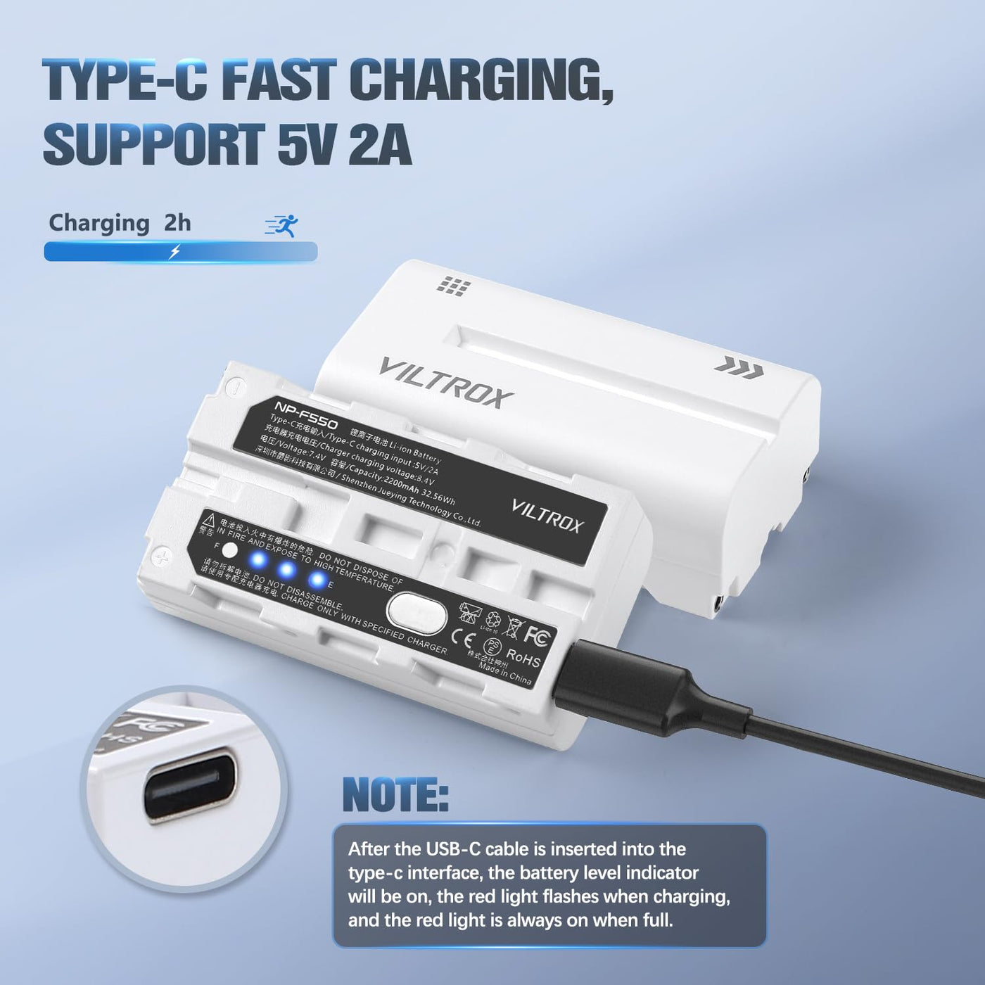 Q: How can I charge the VILTROX NP-F550 battery?A: You can charge the VILTROX NP-F550 battery using a traditional charger or through the built-in Type-C input port, which allows for fast and convenient USB-C charging.