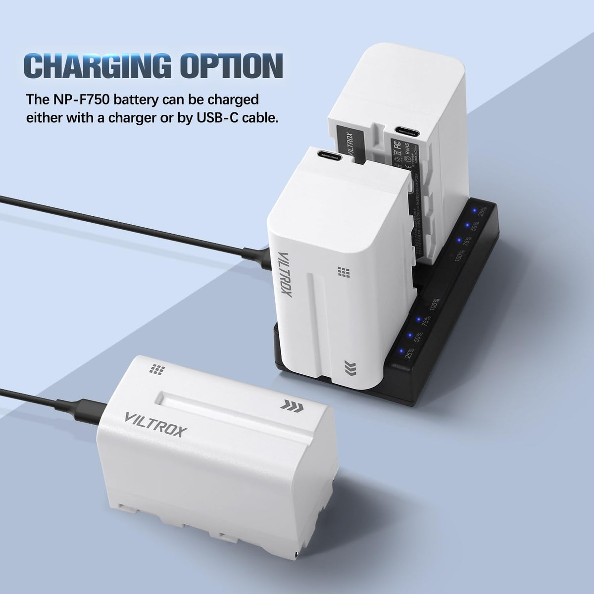 Q: How does the VILTROX NP-F750 battery charge?A: The VILTROX NP-F750 battery can be charged using a compatible charger or through a Type-C USB cable, providing flexibility and convenience for users.