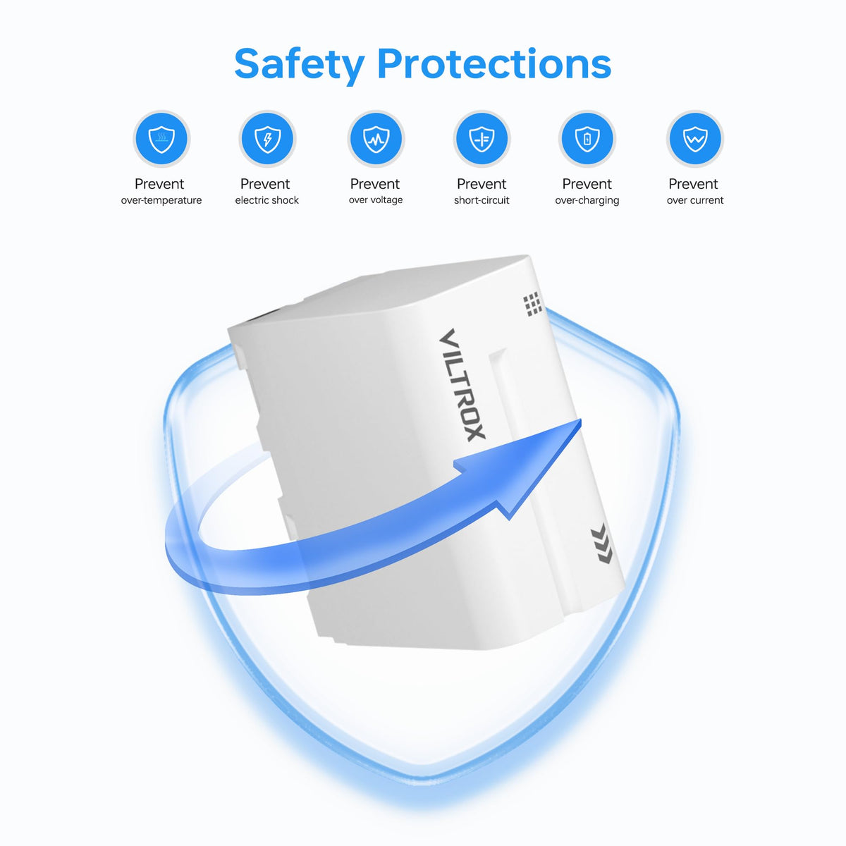 Q: Does the VILTROX NP-F970 Battery come with any safety features?A: Yes, the VILTROX NP-F970 Battery is CE, FCC, and RoHS listed and includes multiple safety protections such as short-circuit protection, over-voltage protection, over-charge protection, over-discharge protection, and over-current protection.