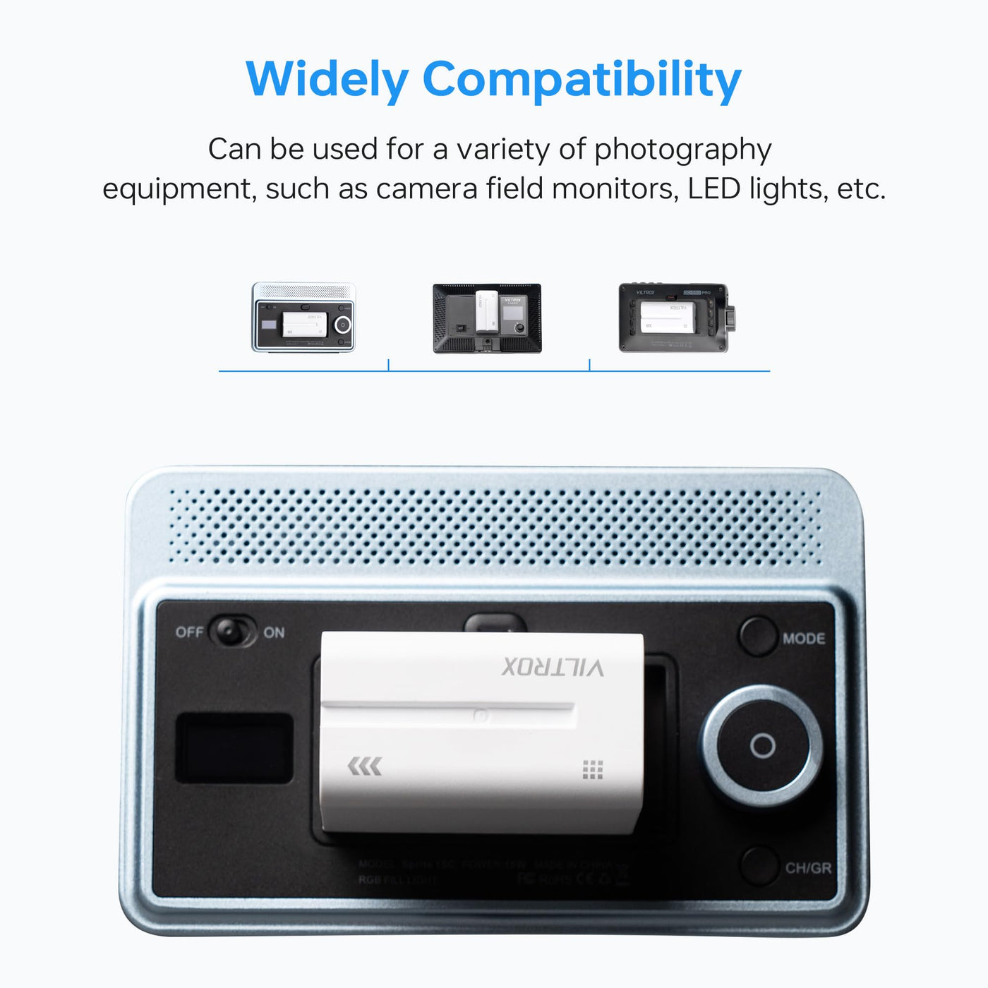 Q: What devices are compatible with the VILTROX NP-F970 Battery?A: The VILTROX NP-F970 Battery is compatible with a wide range of devices including NP-F970, F960, F770, F750, F570, F550, F530, F330, and more. It can be used as a backup battery for LED video lights and camera monitors.