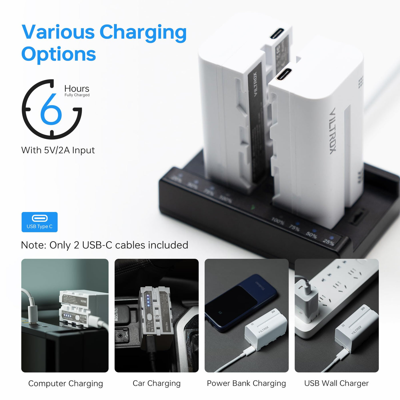 Q: How long does it take to charge the VILTROX NP-F970 Battery?A: The VILTROX NP-F970 Battery can be fully recharged in approximately 6 hours using a USB Type-C 5V/2A charger. Please note that the charger is not included in the package.