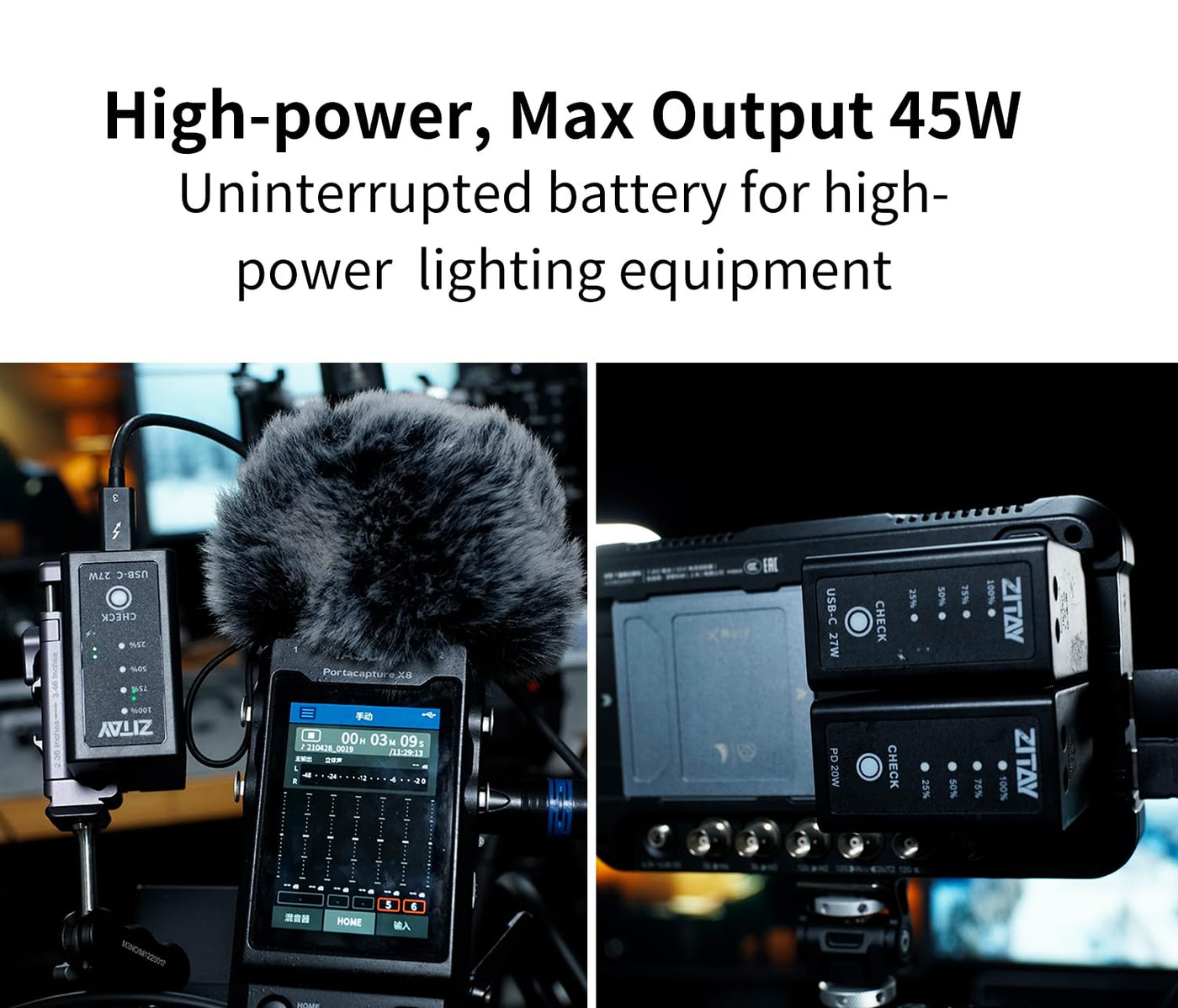 Q: Can I charge the battery while using it?A: Yes, the ZITAY NP970 features both DC and USB-C ports that support bidirectional current flow, allowing you to charge the battery while it powers your device, ensuring uninterrupted shooting.