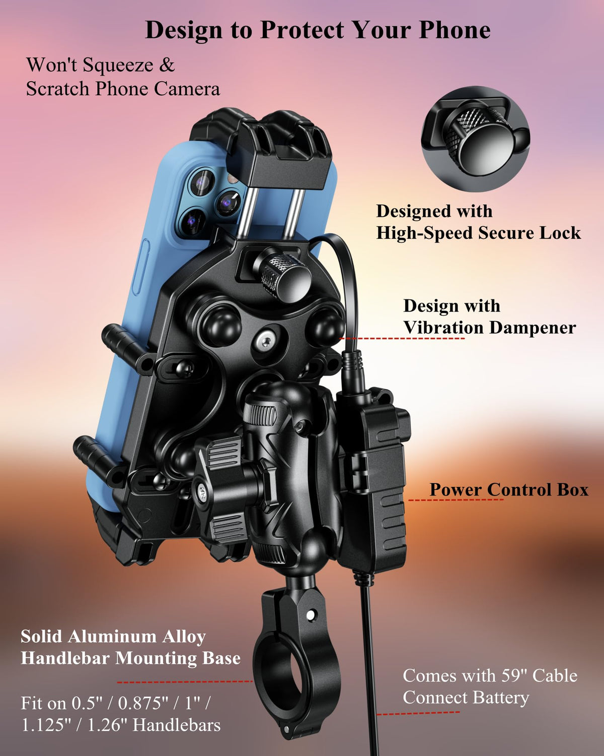 Anti-Theft Motorcycle Phone Mount With Qi 15W Wireless Charger & 30W Pd/Usb-C Fast Charging Port. With Vibration Dampener & High-Speed Secure Klock Design. Fit On 0.5'' / 0.875'' / 1'' / 1.125'' / 1.26'' Handlebars. Package Also Includes Rear-View Mirror Mounting Base. Convenient For You To Install The Phone Holder On The Motorcycle Mirror. The Body Size Of The Motorcycle Phone Mount Can Be Adjusted According To The Size Of Your Phone. Holds Phones (Case Included) Dimensions: Length 5.03'' (128Mm) ~ 7.59'' (193Mm), Width 2.48'' (63Mm) ~ 3.46'' (88Mm), Thickness 0.787'' (20Mm ) Max. Compatible With Phone Screen: 5.4''~7.2''