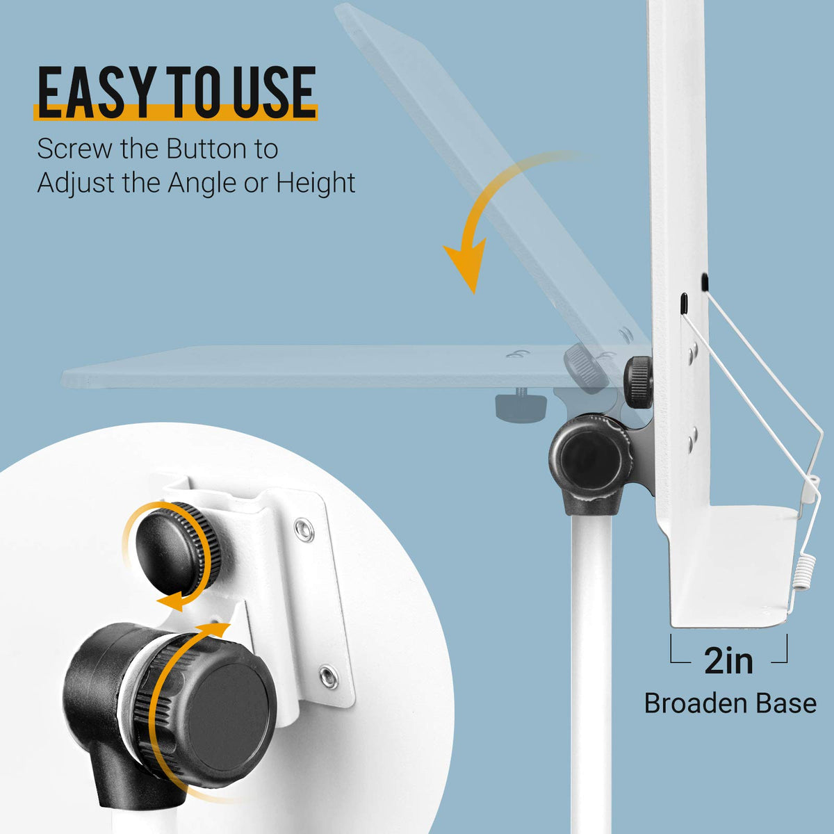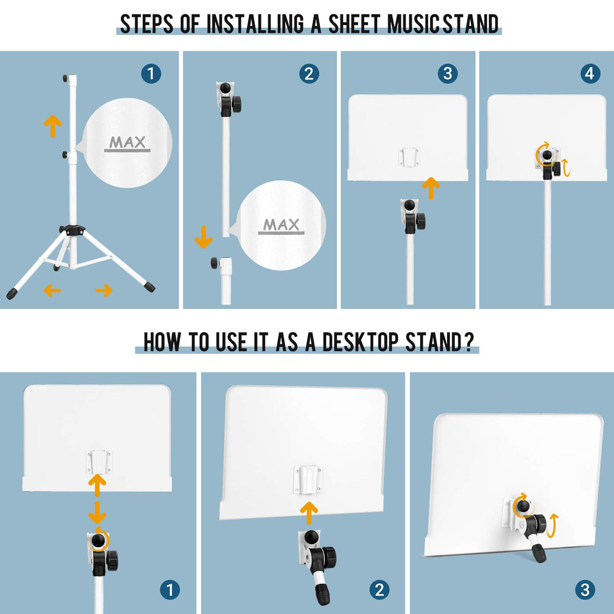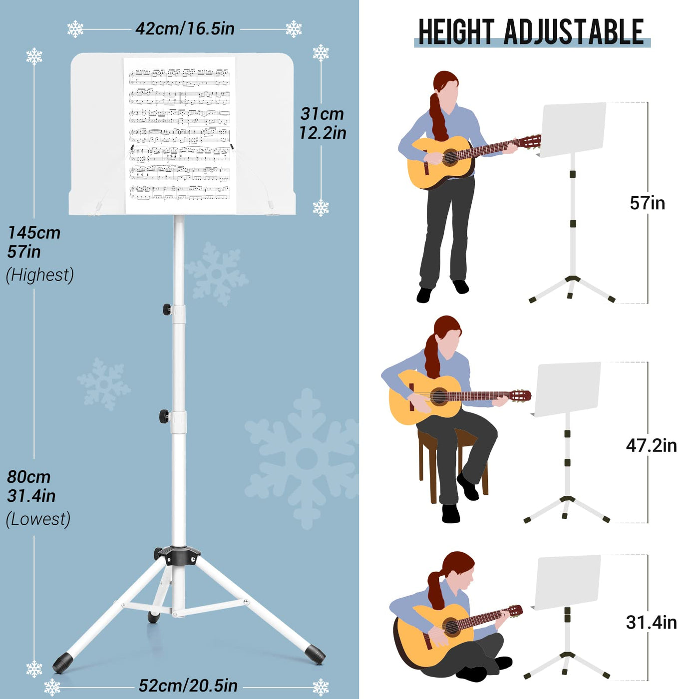 Cahaya Sheet Music Stand & Tabletop Music Stand Solid Back With Carrying Bag For Books Notes Laptop Tablet Whiteheight And Titling Angle Adjustable: Stand Height Adjustable From 314 To 559 2A Deep Tray Is Wide Enough To Hold Any Kind Of Music Sheet Or Books Metal Spring Arm Extensions Hold Music Sheets And Songbook Securely In Place Flexible Tilting Bookplate Can Be Adjusted Up To Any Proper And Comfortable Viewing Angle As You Need, Fits For Using While Sitting Or Standingupright Music Stand & Table Top Stand Dual Use: Not Only A Straight Solid Back Music Stand, It Could Be Converted To A Table Top Stand By The Short Desktop Support Provided Which Enables Using It As A Tabletop Notes Stand Or Music Sheet Standheavy Duty Withstand Weights Up To 12Pounds: Music Tray And Tube Is Made Of Strong Thick Steel, Holds Item Weight Up To 12Pounds Bookplate Dimension: 165A X 122A Easy To Use Knobs For Making Fine Tilting Adjustments More Than Just Sheets, Feel Free To Put A Notes Book Or Tablet Or Laptop Or Projector On The Tray Fits For Guitars Violin Drums Saxophone And Other Musical Instrument Playerssturdy And Easy To Assemble: Tripod Could Be Secured By The Knob At The Bottom, As Tripod Legs Extend Farther Outwards Than Others Which Make Music Sheet Stand Steadier Easy To Assemble In Seconds And Folds Flat For Easy Transport And Storageportable Comes With A Carry Bag: Tripod Legs Can Be Folded Up, Comes With All Parts Stored In A Carrying Bag We Provided Package Includes: Bookplate X 1, Tripod X 1, Desktop Support X 1, Carrying Bag X 1 (Note: Only 1 Bookplate In The Package)