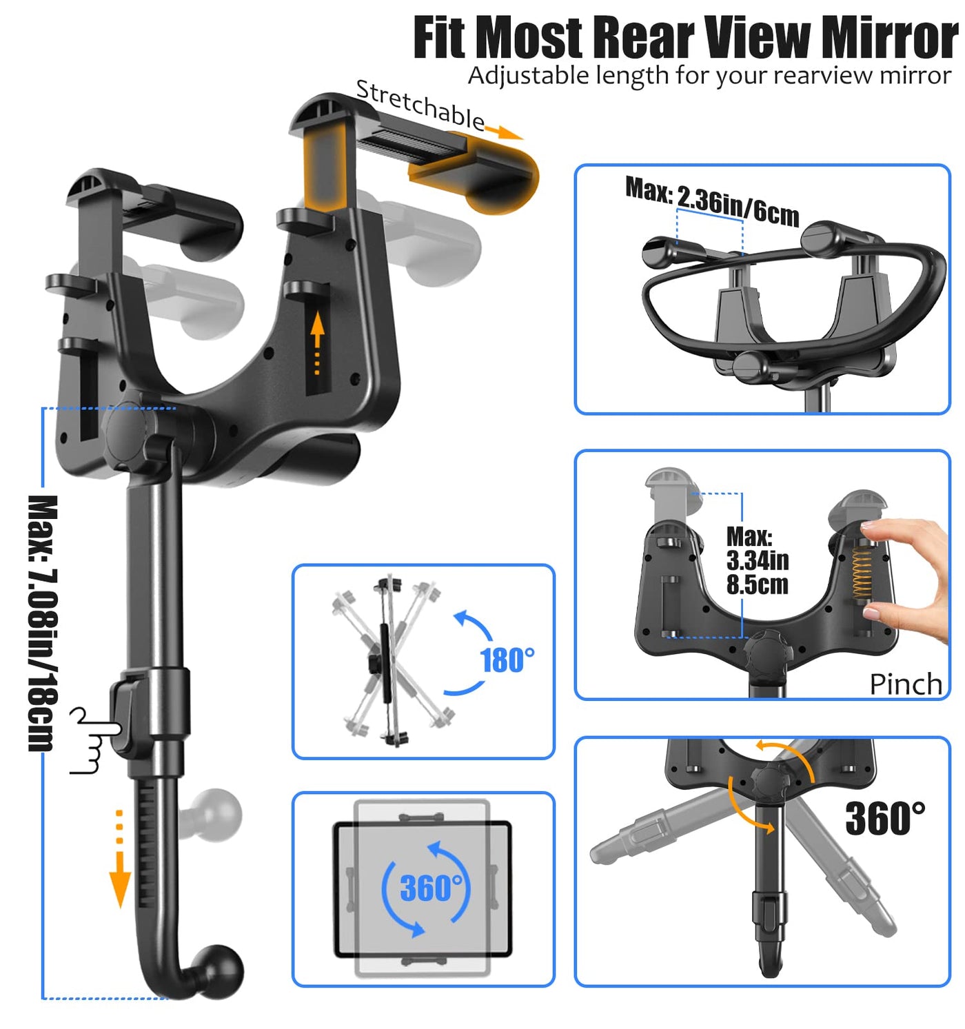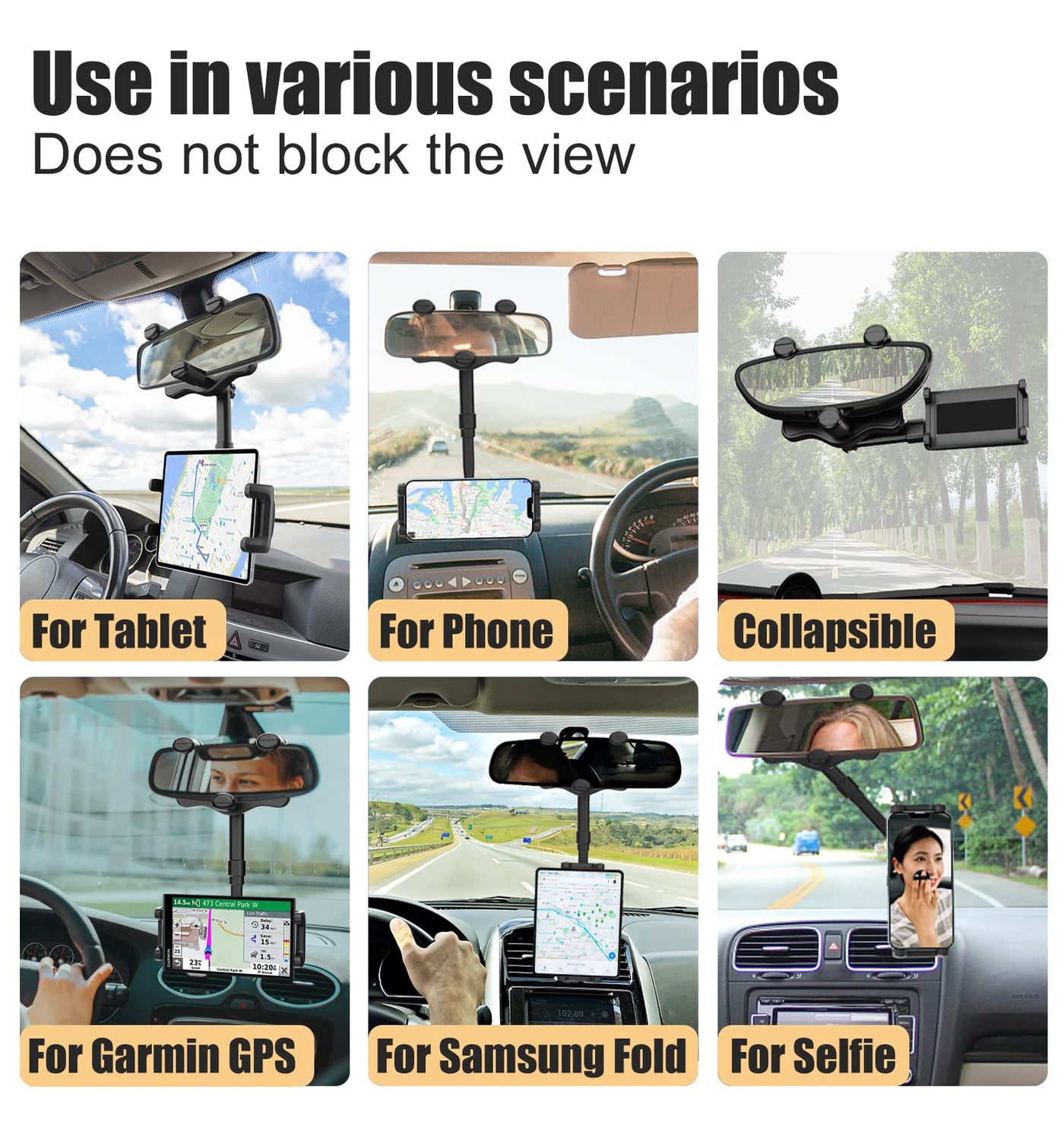 Charchendo Tablet Phone Mount For Car Rear View Mirror Fits 4 13'' Devices, 360 Retractable Rearview Mirror Phone Holder Anti Sh
