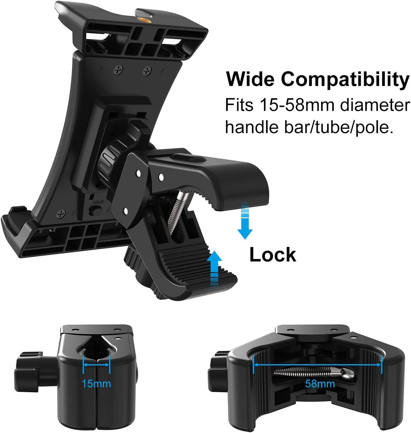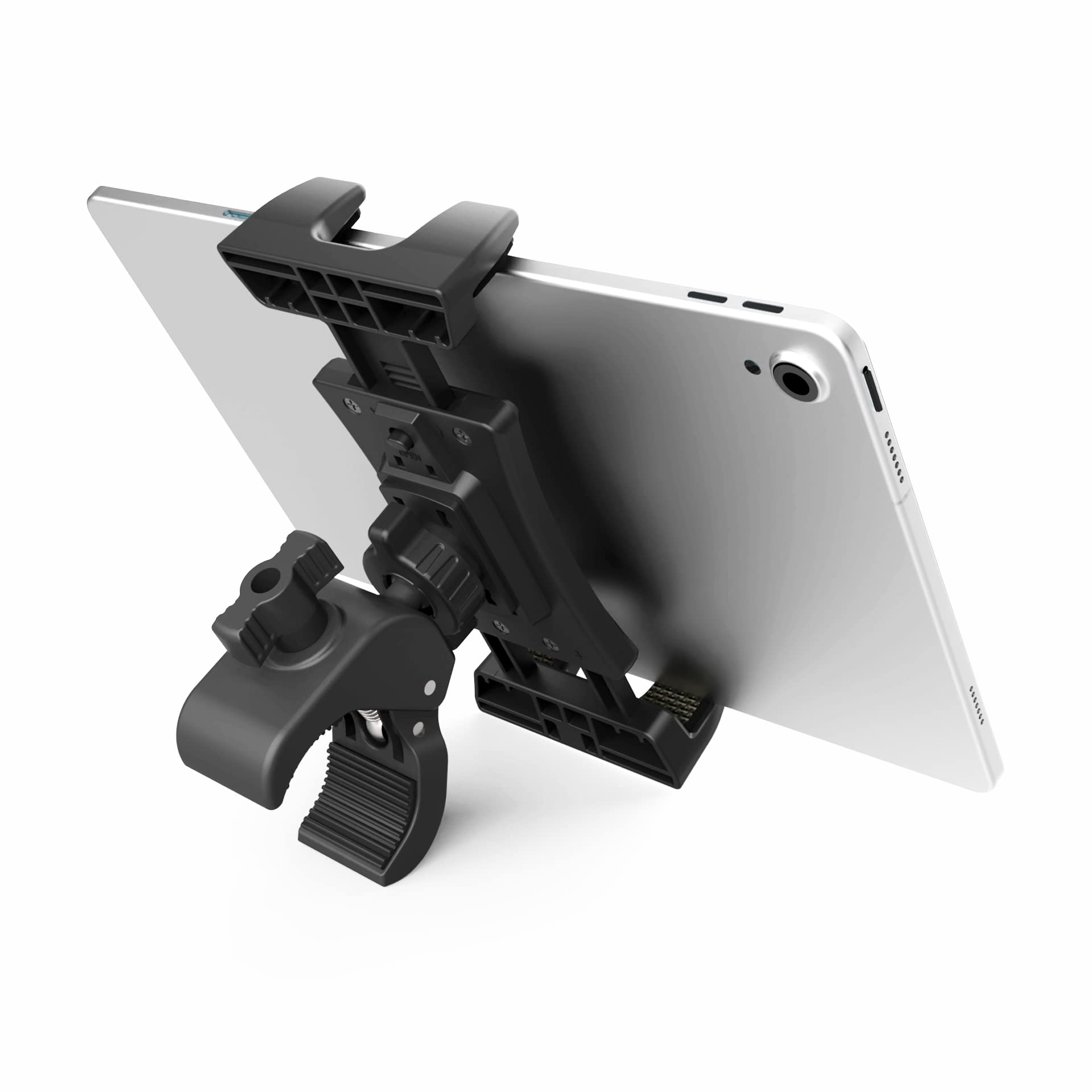 Product Description Our Bike Ipad Tablet Holder Can Stable Hold Your Ipad And Smartphone On Handlebar, You Could Easily Use Your Ipad Smartphone (And Any Other Tablet) To Enjoying Yourself, Such Gym, Treadmill, Spinning Bike, Elliptical, Other Exercise Equipment, Microphone Stand, Boat Helm, Wheel Chair, Etc 1. Tablet Phone Holder 360 Rotation &Amp; 40 Tilt Supports Devices In Both Mode Landscape &Amp; Portrail, More Confortable Viewing 2. Bike Tablet Phone Mount Made Of Abs, The Solid Structure, Thick Spine And Ball Joint Supporting Pivot At The Back Centre Make Sure Your Ipad Be Held Very Steadily, Not Wobble 3. The Four Claws Use High Density Sponge Pad With More Friction, They Can Tightly Hold Your Thin Tablet And Protect It From Scratch 4. Tablet Phone Mount Allows To Access All Ports Without Blocking Magnetic Connector, Mic And Power Port 5. Heavy Duty Handlebar Clamp Can Clamp Onto Bar Post Tightly, Never Loosen Specifactions: Material: Abs Color: Black Net Weight: 215Gram Package: 1 X Bike Ipad Tablet Holder Mount 1 X Heavy Duty Handlebar Clamp Fit For: ? Ipad Pro 12.9 / 11 / 10.5 / 9.7, Ipad 10.5 / 9.7, Ipad Air 9.7, Ipad 1 2 3 4 5, Ipad Mini 12 3 4 5 ? Samsung Galaxy Tab S4 S3 S2 S E A 4 3 2 Pro (7'', 8'', 8.4'', 9.6'', 9.7'' 10.1'' 10.5'') ? Surface Pro 7 6 5 4 3 ? Asus Zenpad 3S Z10 S C 10 Z8S Z8, Memo Pad 8/Fhd 10, Vivotab 8, 7'' 7.9'' 8'' 9.7'' 10.1'' Tablet ? Lenovo Tab 4 Plus / 4 / 3 / 2, Idealtab S5000 / A1000 / A1000L / A10-70 / A8-50 / A2109 / Mixx2 / Mixx / K3 / S2110 / S2109 / A2107 ? Lg G Pad V400 V700 Lk460 V930 V498 V530 V480 Uk750 V940N V520 V521 Ak495 Uk495 ? Google Nexus 10 9 7 ? Nokia N1 Pad 7.9'' ? Sony Xperia Z4 Z3 Z2 Z Tablet Smartphone: (Smartphone Can Only Be Clampped In Portrail Mode) Iphone 11 Pro / 11 / Xr / Xr Max / 10 Samsung Galaxy S20 S10 S10+ S9, Note 20 10+ 10 9 8 All Smartphone With Length More Than 12Cm(4.7In)
