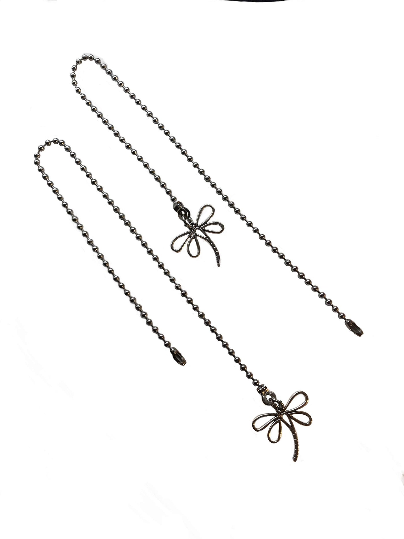 Add Some Personal Flair To Your Pull Switches To Your Lights Or Fans. These Beautiful, Decorative Light Pulls Act As A Pull Chain Extension Or Replacement. Simply Remove The Existing Ornament From Your Current Ball Chain And Connect These Two For The Lamp And For The Fan. Approximately 12 Metal Ball Chain. They Each Come With A Ball Chain Coupler For You To Add Them To The Existing Chain. The Couplers Fit 2.8 - 3.2Mm (The Average Size Of Many Pull Chains For Ceiling Fans) So Be Sure To Check The Size Of Your Current Chain. Largest Measurements 13.88 X 1.24 X 0.15. If The Chain Is Too Long, It Can Be Cut To Desired Length. These Are Pewter Dragonflies And Over Time May Tarnish. Polish Will Clear That Up.