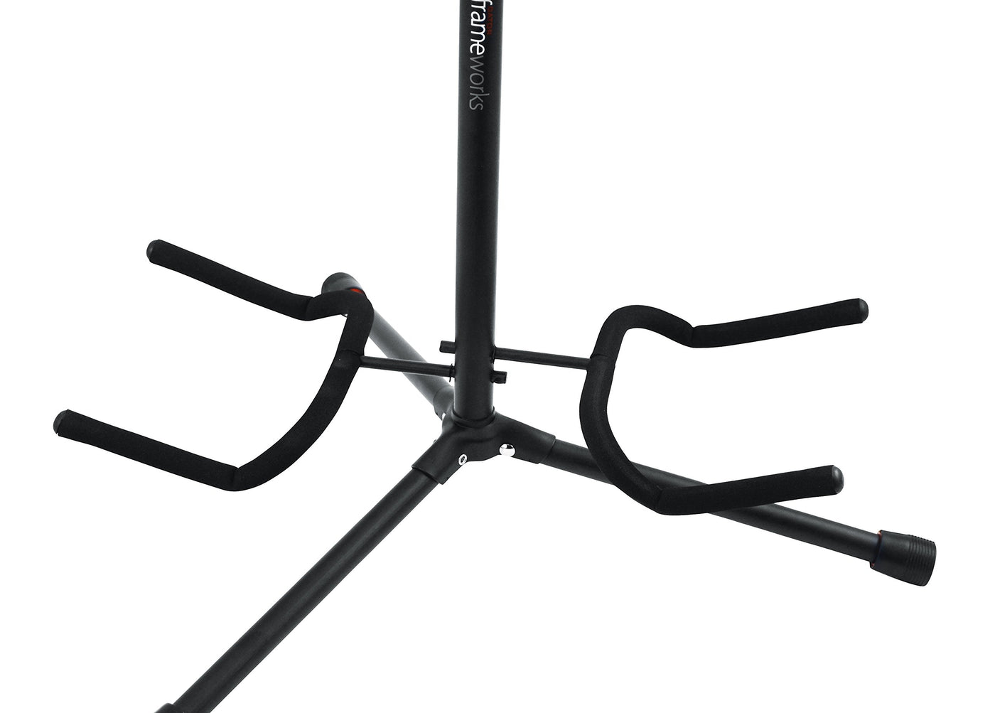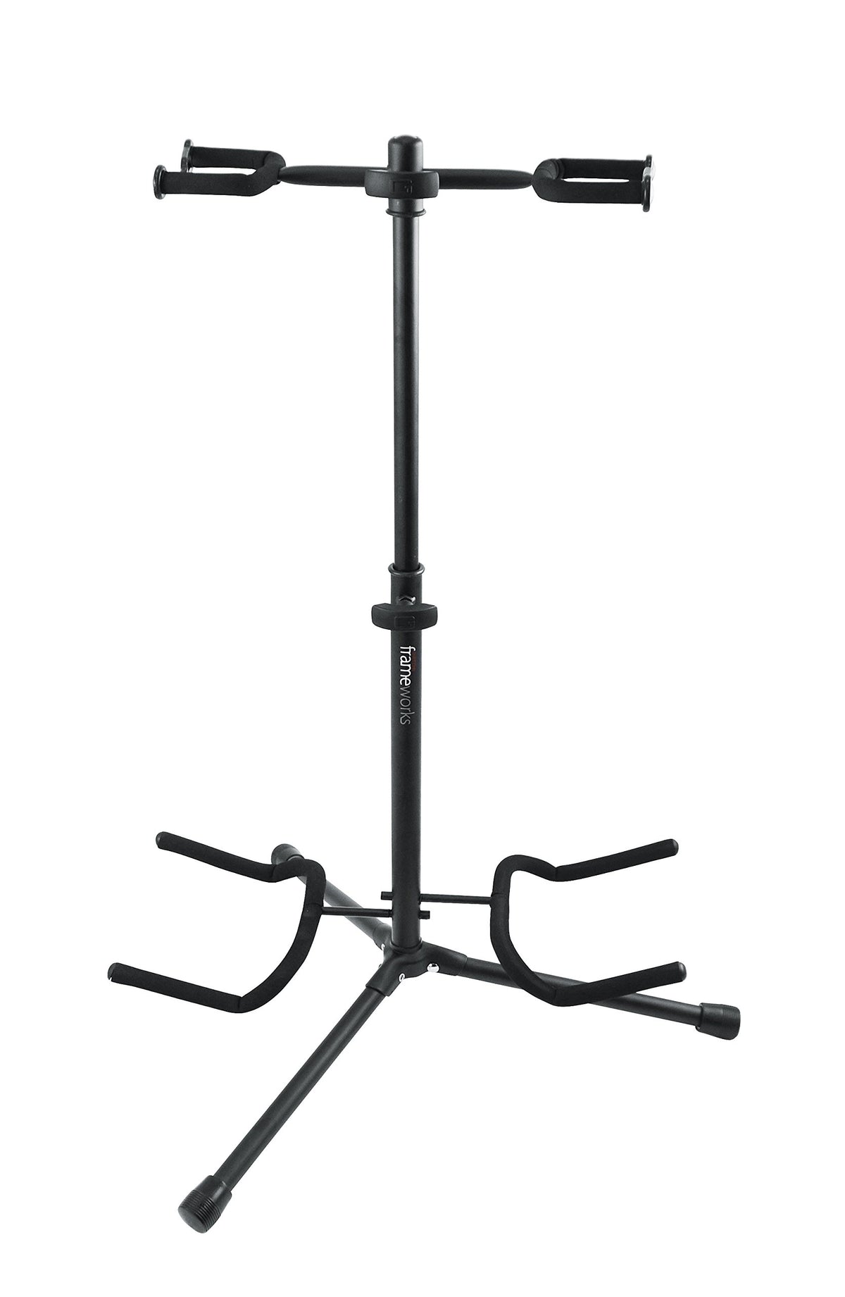 Gator Cases Frameworks Double Electric Guitar, Bass Guitar, Or Acoustic Guitar Stand Will Keep Your Guitars Out Of The Way Of Potential Hazards That Could Result In Damage To Your Precious Instrument. The Gfw-Gtr-2000 Double Guitar Stand Features Finish Friendly Rubberized Cradle Padding, Two Durable Neck Restraints That Secure The Guitars On The Stand, As Well As A Robust, Heavy-Duty Steel Construction. The Gfw-Gtr-2000 Also Features Removable Red Safety Trim On Each Of The Three Stand Feet. The Height Of The Neck Cradle Is Also Adjustable To Provide More Stability If Needed. The Frameworks Series Of Stands, Including The Gfw-Gtr-2000, Boasts A Wide Variety Of Innovative, Reliable Products Designed To Support Your Music!Gator Cases Is Known For Manufacturing Innovative Products Designed To Protect! We Offer A Wide Range Of Available Sizes, Materials, And Protection Levels, For All Types Of Instruments And Gear Including Frameworks Stands, Rackworks Install Racks And Accessories, And Protechtor Drum Cases. It Isnt Hard To Find A Great Reason Why Gator Should Be The Brand You Trust To Protect Your Equipment For Life!