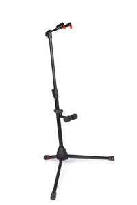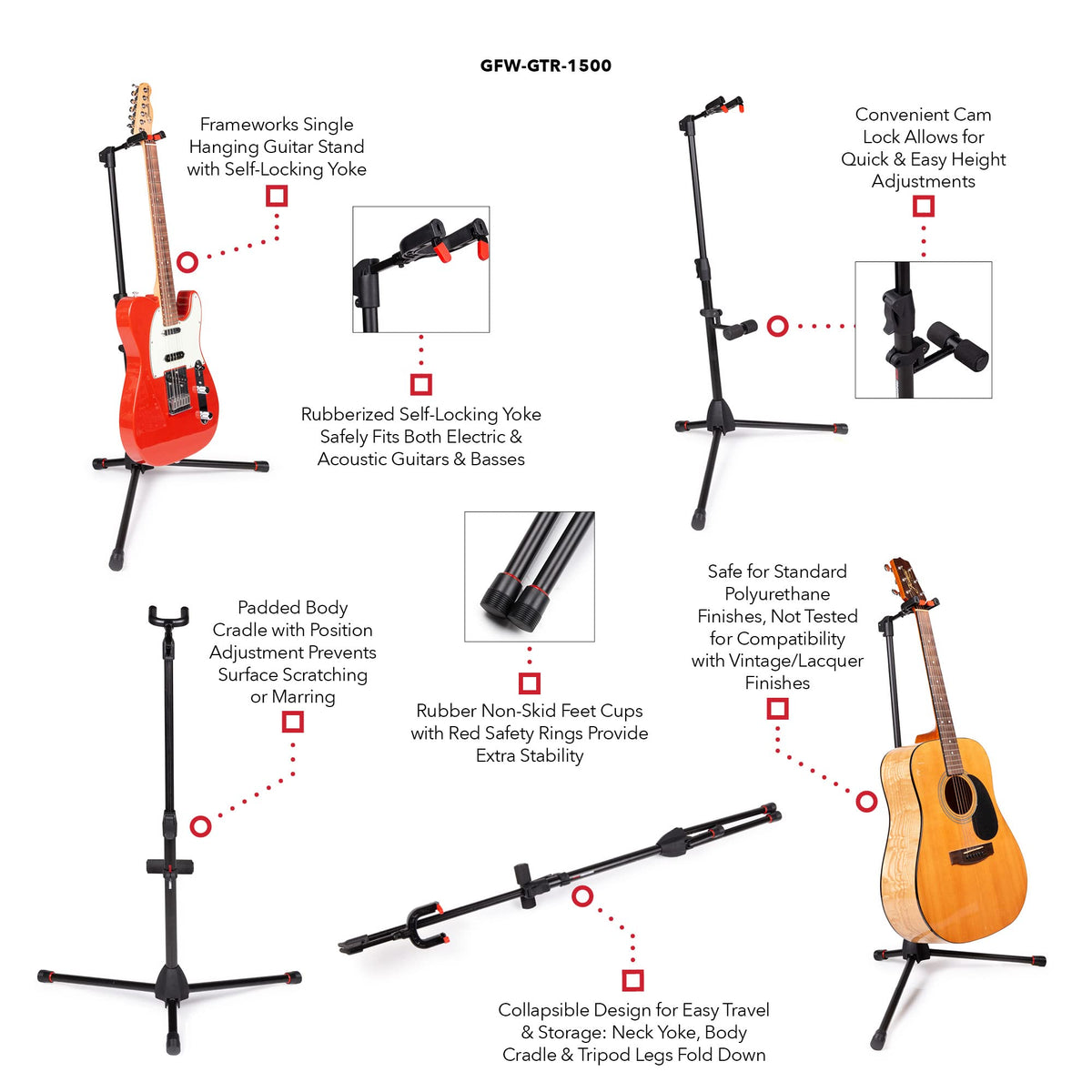 Do You Ever Catch Yourself Placing Your Guitar Back Onto Its Stand, Then Gradually Stepping Backwards While Slowly Repeating The Word Stay , Just Like You Would To A Puppy In Training? A Guitar Stands Utmost Purpose Is To Provide A Haven For Your Treasured Instrument, Yet Countless Yokes Are Left Wide Open And Ready For Disaster. All It Takes Is A Single, Gentle Nudge And Your Guitar Leans Forward, Soon To Meet Its Crashing Fate. The Self-Locking Guitar Stand By Gator Frameworks Saves You A Trip To The Luthier. A Specially Designed Yoke Keeps Your Guitar From Falling Out With Its Integrated Self-Locking Mechanism. When Attached, The Weight Of The Guitar Activates Dual Rubberized Guards, Keeping It Secured To The Stand. A Padded Body Cradle At The Bottom Prevents Scratches By Preventing Any Unwanted Contact Between Instrument And Metal. To Set The Stand At The Perfect Height, Simply Locate The Locking Cam Lever And Perform Adjustments As Needed. The Stand Also Travels Easily With Its Collapsible Base, Folding Neck Yoke And Folding Body Cradle.