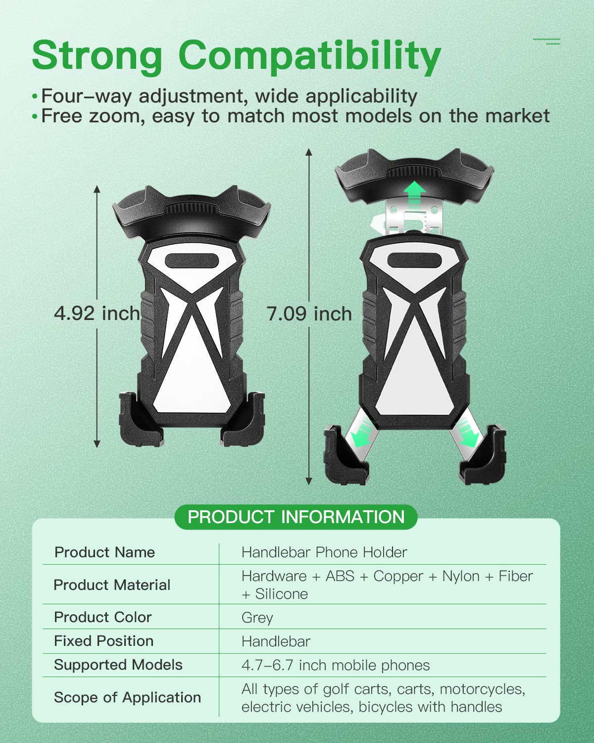 Specification: - Color: Grey - Material: Abs+Copper+Nylon+Fiber+Silicone - Universal Mobile Phone Height 4.92-7.08Inch, Width 2.75-3.74, Thickness Between 0.6Inch - Support Tube Diameter: Between 0.6-2.36Inch - Universal: For Golf Cart, Push Cart, Baby Stroller, Shopping Cart, Bike, Motorcycle, Boat, Spin Bike, Bicycle Handlebars Etc. Feature: - Hardware Structure - Copper Gear - Simple Stretching Operation - Easy To Use - Strong Versatility - Flexible And Changeable