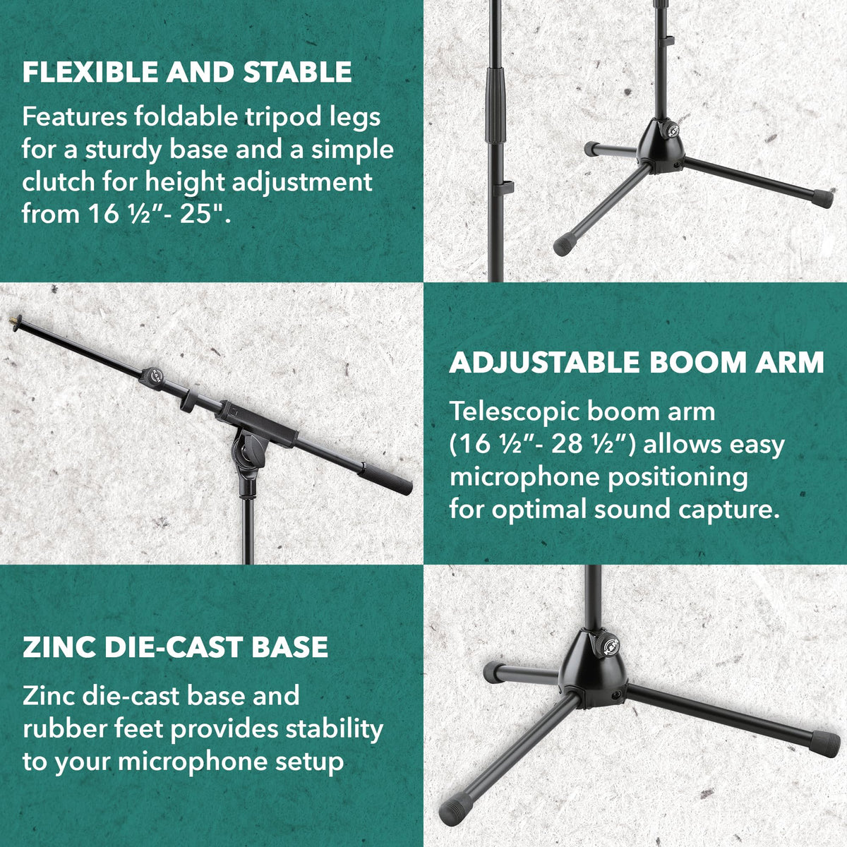 K&M K�nig & Meyer 25977.500.55 Shorter Microphone Tripod Stand With Telescoping Height Adjustment From 16.5� To 25� And A 2-Piece Telescoping Boom Arm With A 16.5� To 28.5� Reach For Precise Mic Positioning. The Foldable Legs Allow The Stand To Collapse To A Smaller Size For Storage And Travel.