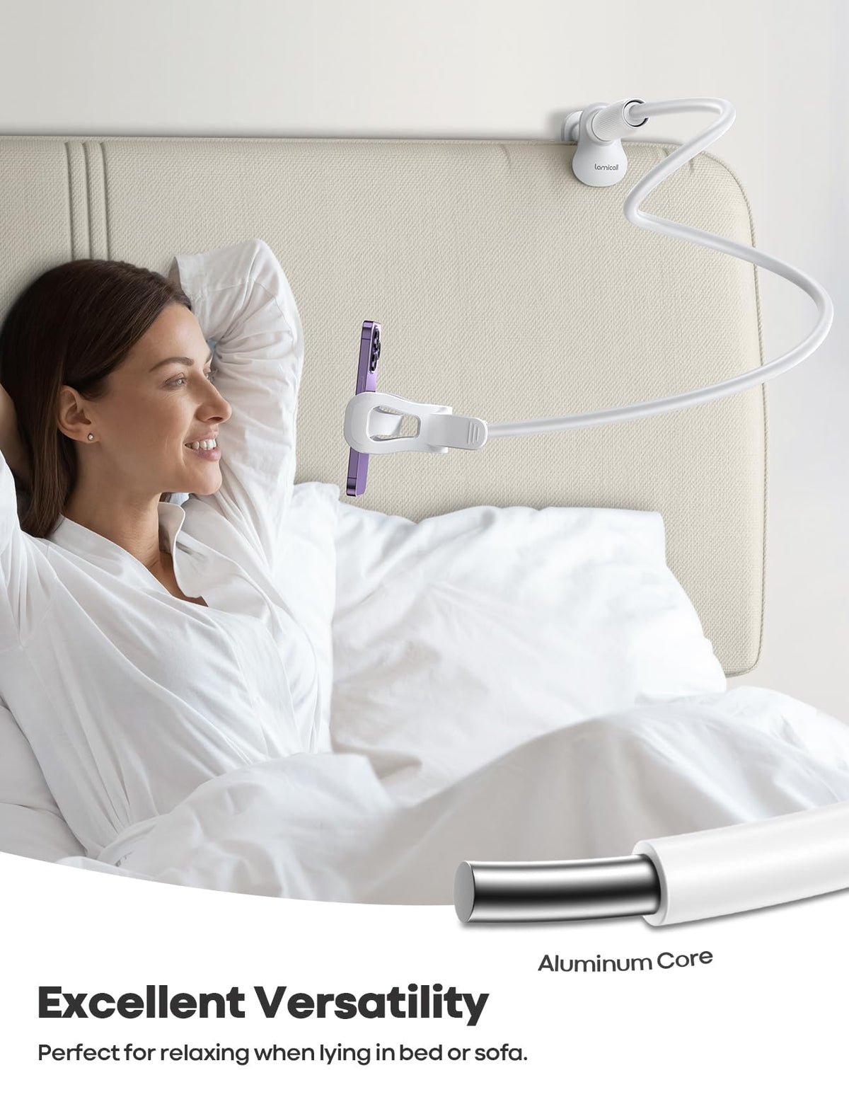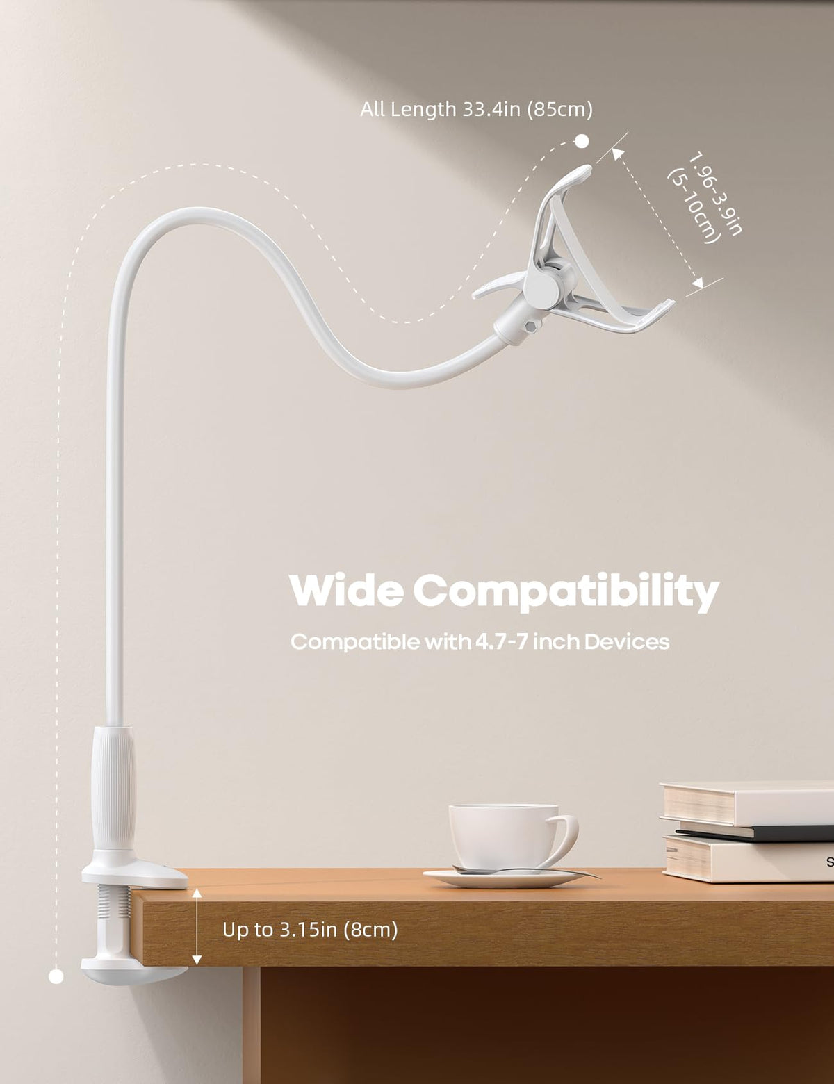The Gooseneck Cellphone Holder Stand Is Designed For People To Free Their Hands While Lying Down In Bed Or On The Sofa, Cooking In The Kitchen, Working In The Office, Face Chatting Near The Desk, Or Filming Overhead On Bed. With A 360 Rotation Gooseneck Clip And Flexible 33.4-Inch Lazy Long Gooseneck Arm Made Of High-Quality Aluminum-Magnesium Alloy Solid Core, People Can Easily Adjust The Best Phone Viewing Angle To Their Preferred Position. And The Gooseneck Arm For Bed Can Be Bent Into Shape S And Z To Be More Stable. The Bendable Long Gooseneck Arm Holder Usefully Prevents People From Neck Pain. The Adjustable Clamp Base Varies From 0 To 3.15 Inches (8Cm), So The Goose Neck Holder Can Be Securely Mounted On Bed, Bedside, Headboard, Nightstand, Desk, Office Table, And Kitchen Counter, Etc. This Gooseneck Cell Phone Holder With A Rubber-Padded Clip Can Be Opened To A Maximum Of 10Cm. The Gooseneck Cellphone Stand Is Widely Compatible With 4-7 Phones, Almost All Smartphone, Cell Phones Like Iphone 14, Iphone 14 Plus, Iphone 14 Pro, Iphone 14 Pro Max, Iphone 12 13 Mini, Iphone 13/ 12/ 11 Pro Max, Iphone Xs, Iphone Xs Max, Iphone Xr, Iphone 8 7 6 5 4 3 2 1, Google Pixel, Nexus, Galaxy S23 S23+ S23 Ultra S22 S21 S20 S10, Switch, Etc.As For The 33.4 Inches (85Cm) Long Arm, Makes The Gooseneck Lazy Arm Sturdy Enough To Hold Your Phone, Celulares Firmly, Yet Flexible To Bend Gooseneck Arm In Any Direction To Accommodate Your View On Bed, Desk. It Will Be A Lifesaver For Protecting You From Neck Pain.