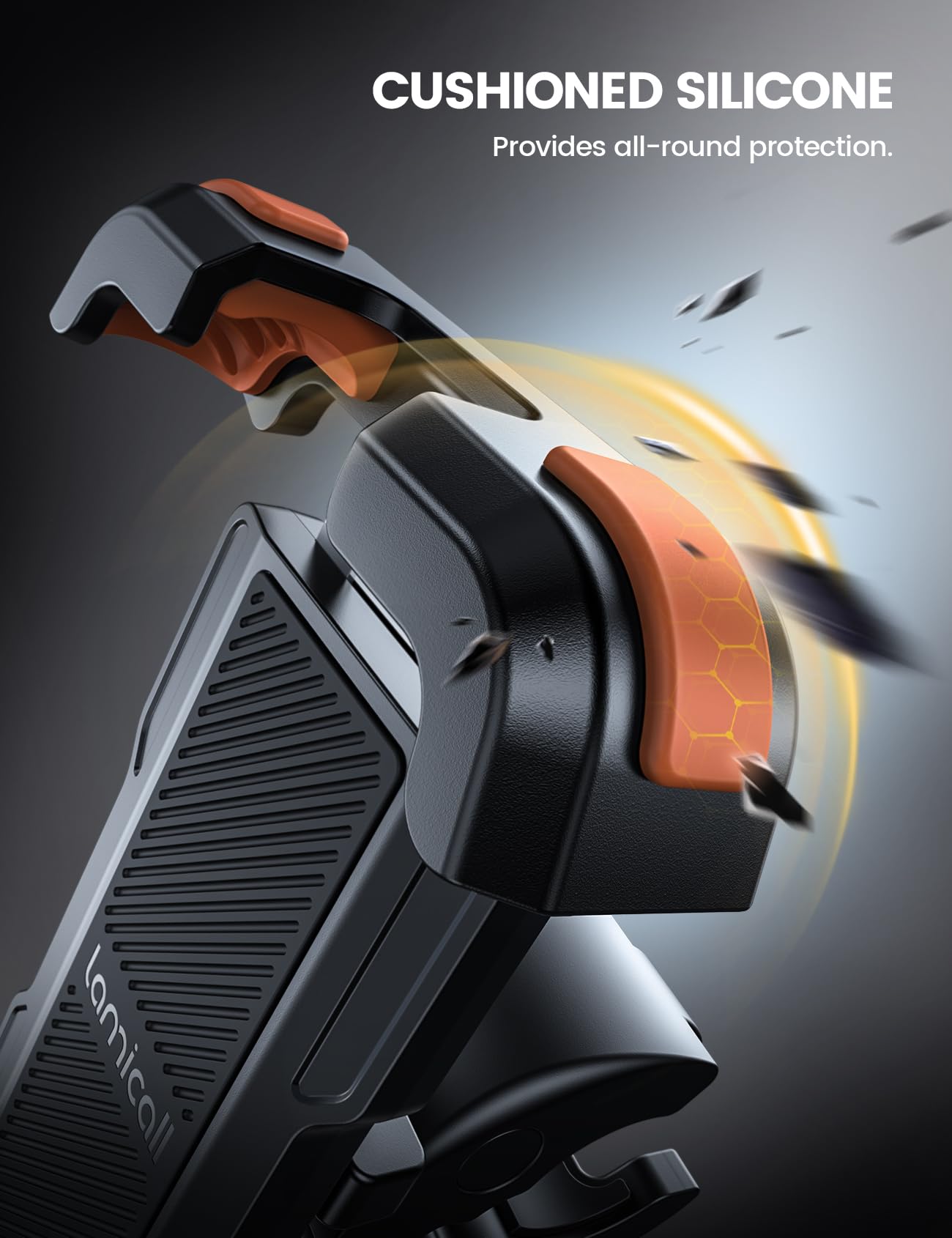Q: What materials are used in the Lamicall Motorcycle Phone Mount for protection?A: The phone holder is equipped with non-slip silicone pads on its corners and back, providing all-around protection against scratches and slips, ensuring your smartphone stays secure during your ride.