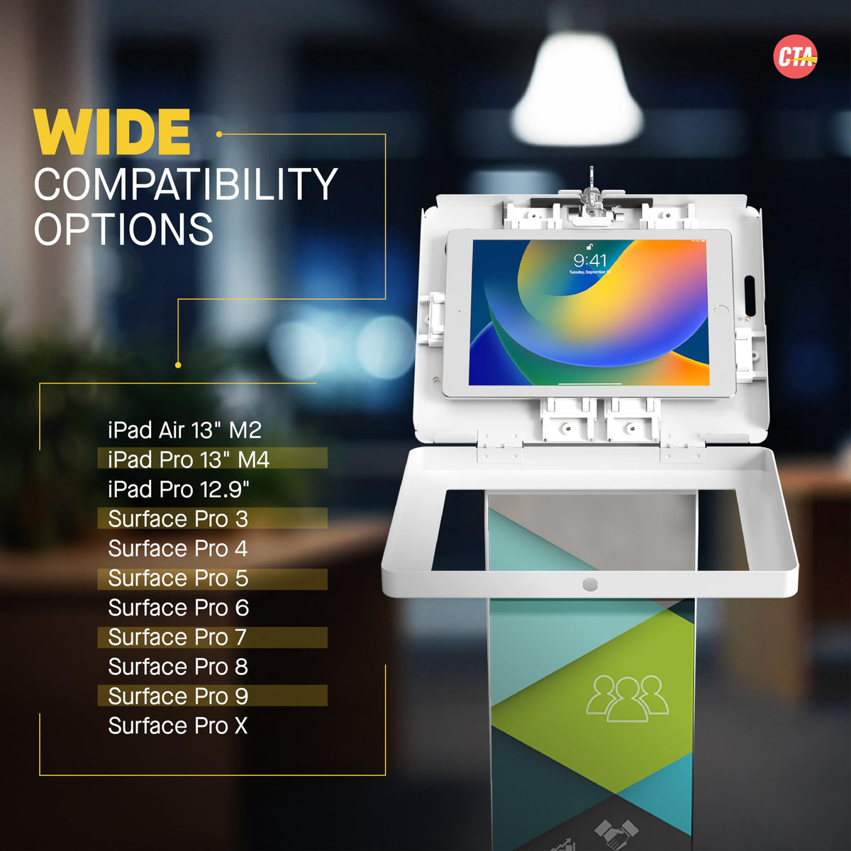 The Locking Floor Stand Kiosk From Cta Digital Makes Your Tablet The Centerpiece Of A Protected Standing Workstation. The Padded Enclosure Protects Your Tablet From Theft With A Lock And Key, Cushioning Your Tablet With Included Model-Specific Foam Adapters. The Enclosure Is Designed To Allow Full Access To Your Tablets Charge Ports And Front Camera. The Enclosure Also Rotates A Full 360 Degrees For Portrait And Landscape Displays. Standing 50 Inches Tall, This Heavy-Duty Floor Stand Boasts A Hollow Interior For Clean Charge Cable Routing, Plus A Weighted Base Equipped With Slip And Scratch Resistant Padding. Compatible With Ipad Air 13-Inch (M3 / M2), Ipad Pro 13-Inch (M4), Ipad Pro 12.9-Inch 3Rd & 4Th Generation - Surface Pro 3/4/5/6/7/8/X.