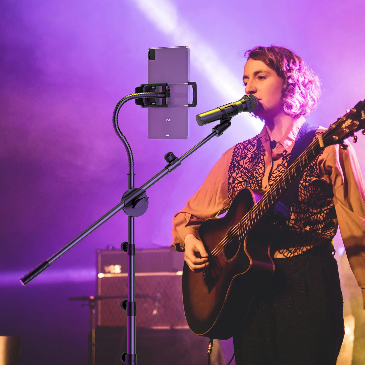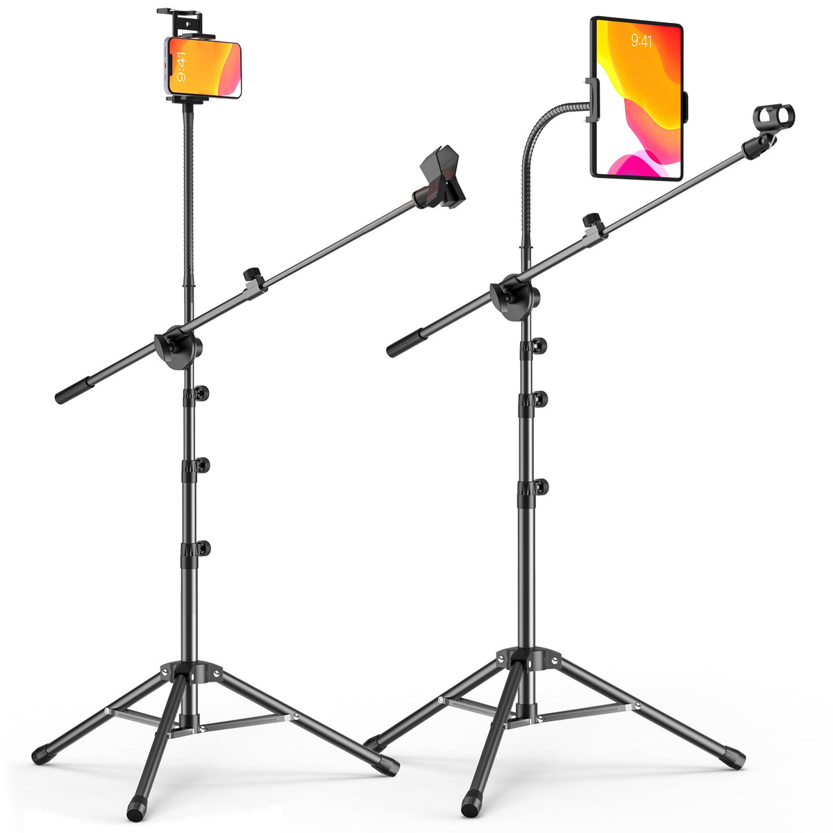 Microphone Stand With Ipad Clip, Floor Foldable Mic Stand With Phone Clip,Heavy Duty Tripod Boom Arm With 2 Mic Clips And Carryi
