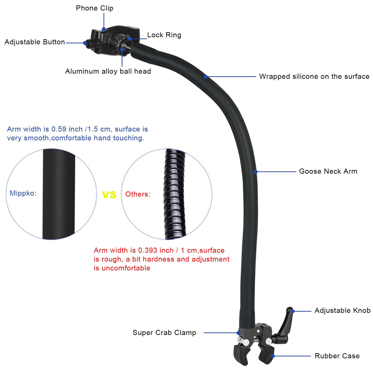 Mippko Gooseneck Phone Holder For Mic Stand/Music Stand/Stroller/Treadmill/Spin Bike/Exercise Bicycle,50 Cm Long Flexible Goosen