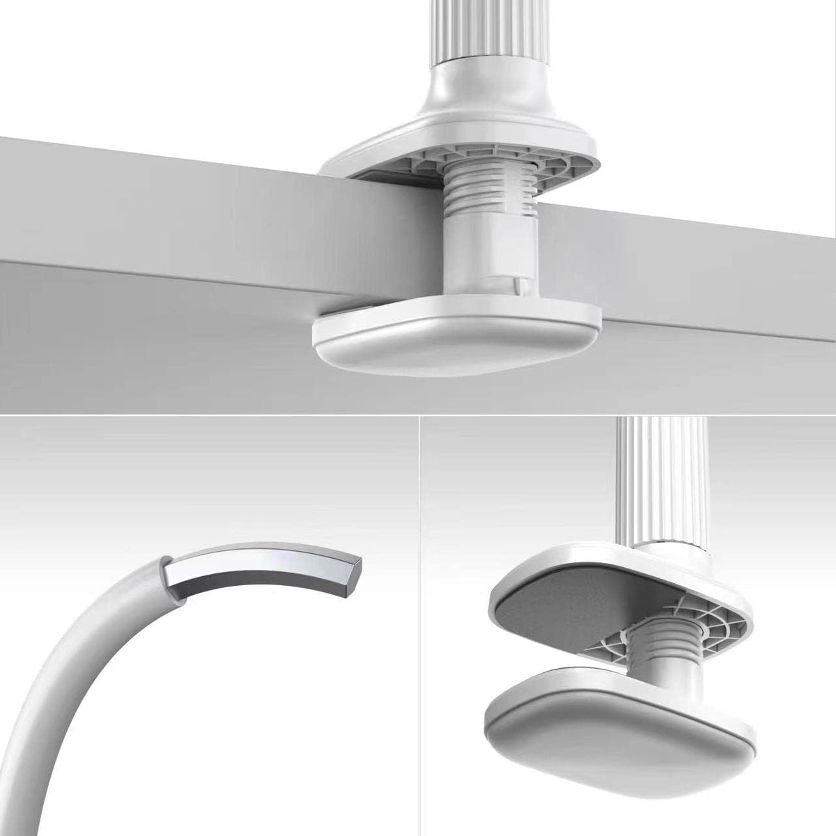 Q: What tips should I follow for using the gooseneck tablet holder effectively?A: For optimal use, position the gooseneck in an 'S' or circular shape when holding a heavier tablet for stability. Always adjust the arm with both hands for better control, and avoid over-tightening the base clamp to prevent damage.