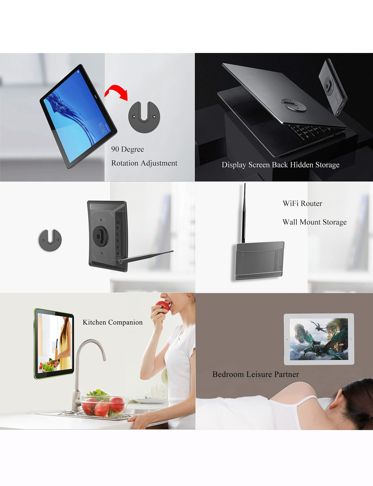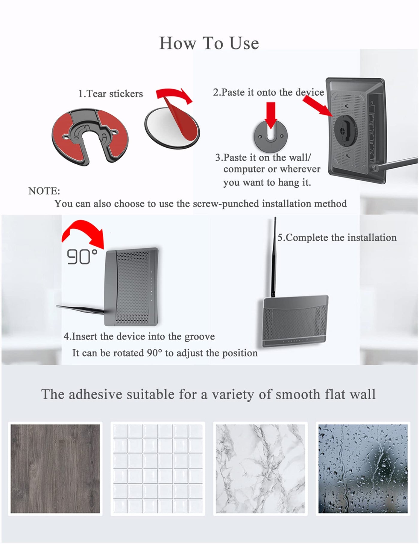 How To Use: A. Strongadhesive Fixed Installation. The Top Cover Of The Holder (Round Part) Is Pasted To The Device And The Base Of The Holder (Grooved Part) Is Pasted To The Wall/Computer Or Wherever You Want To Hang It. Insert The Device Into The Groove. You'Ll Hear A Click, Which Means It'S A Perfect Combination ,It Can Be Rotated 90To Adjust The Position. B. Screw Mounting. Drill The Wall And Fix The Grooved Base With Screws. Note:If Installed With Adhesive, After Installation, Please Wait For 48 Hours Before Starting To Hang Items, This Will Make The Adhesive Stronger.