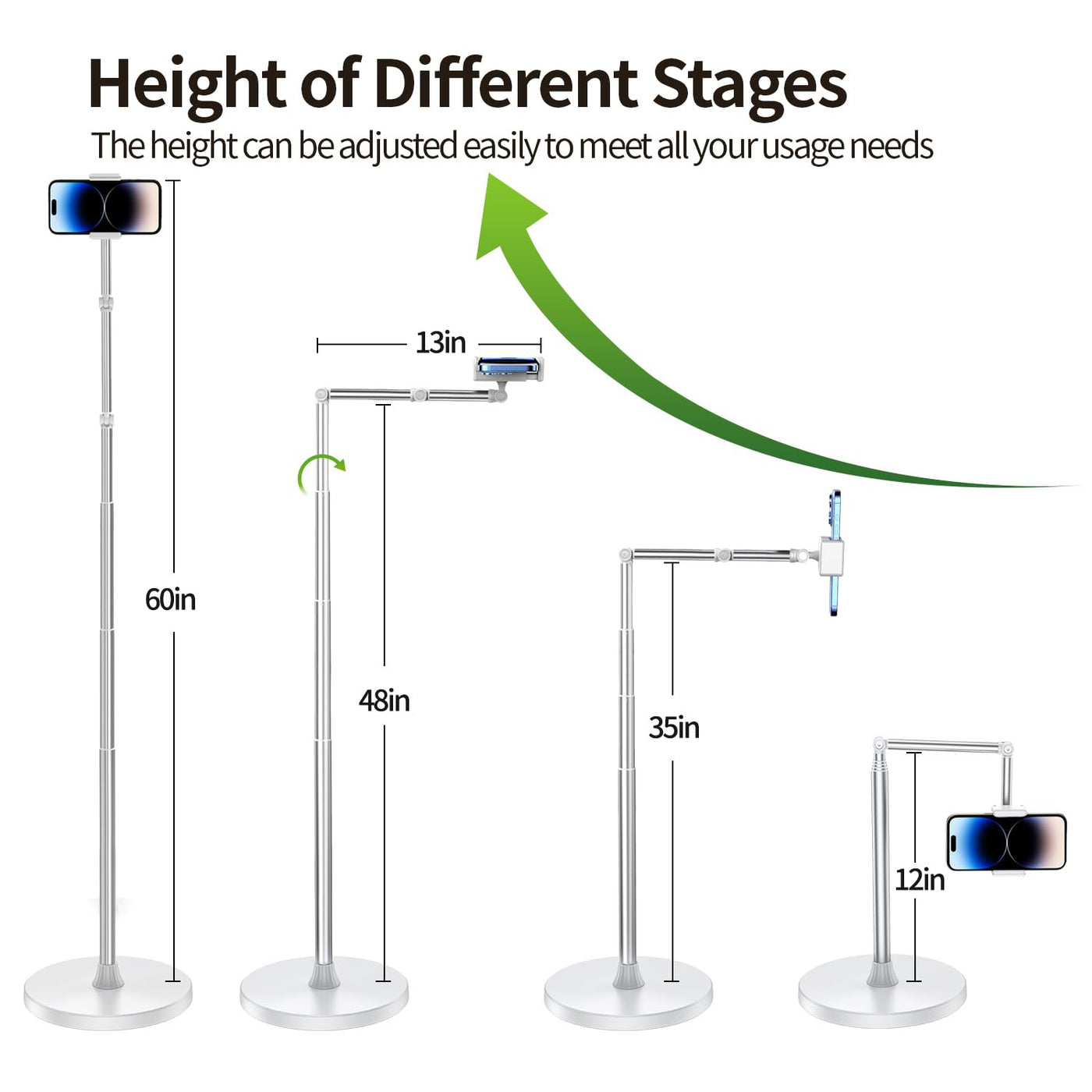 Overhead Phone Mount Floor Phone Holder Stand, Tripod For Recording Cooking Videos, Bedside Adjustable Arm Reading Stand, 360 Ro