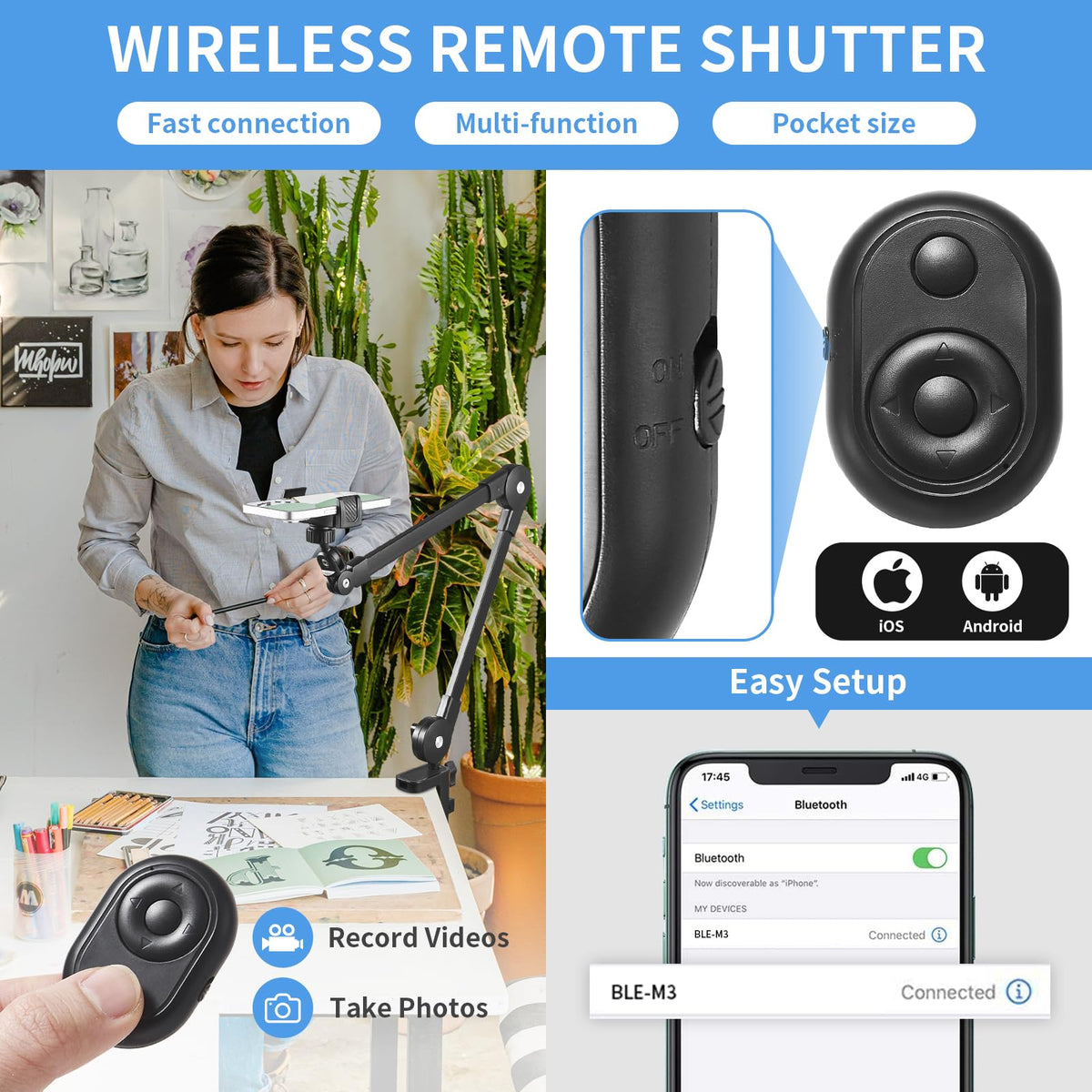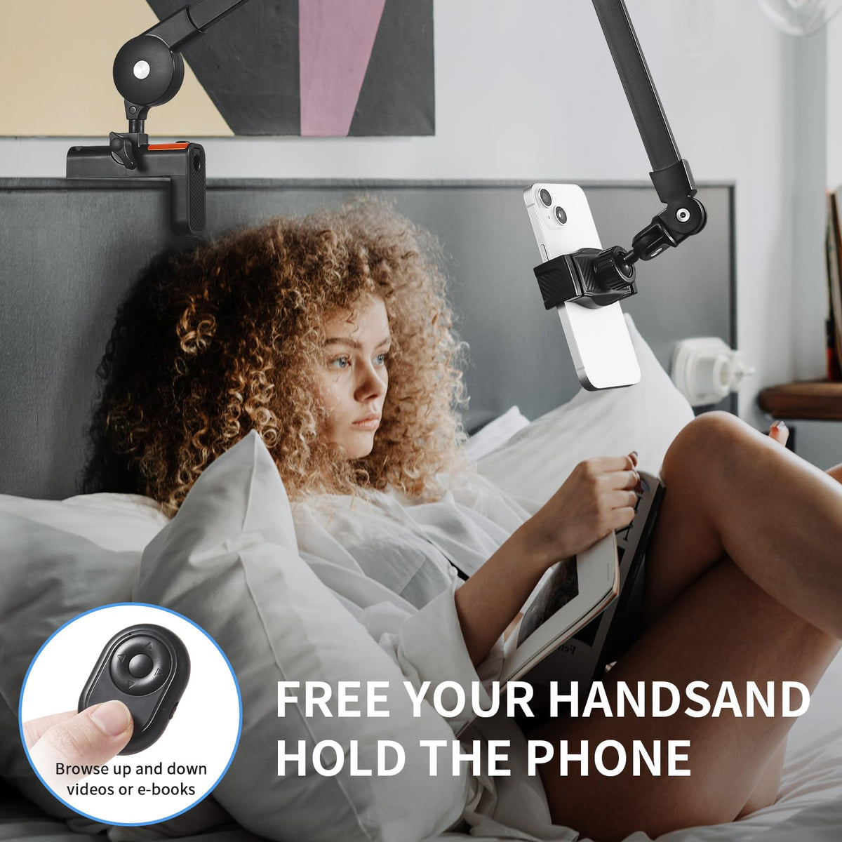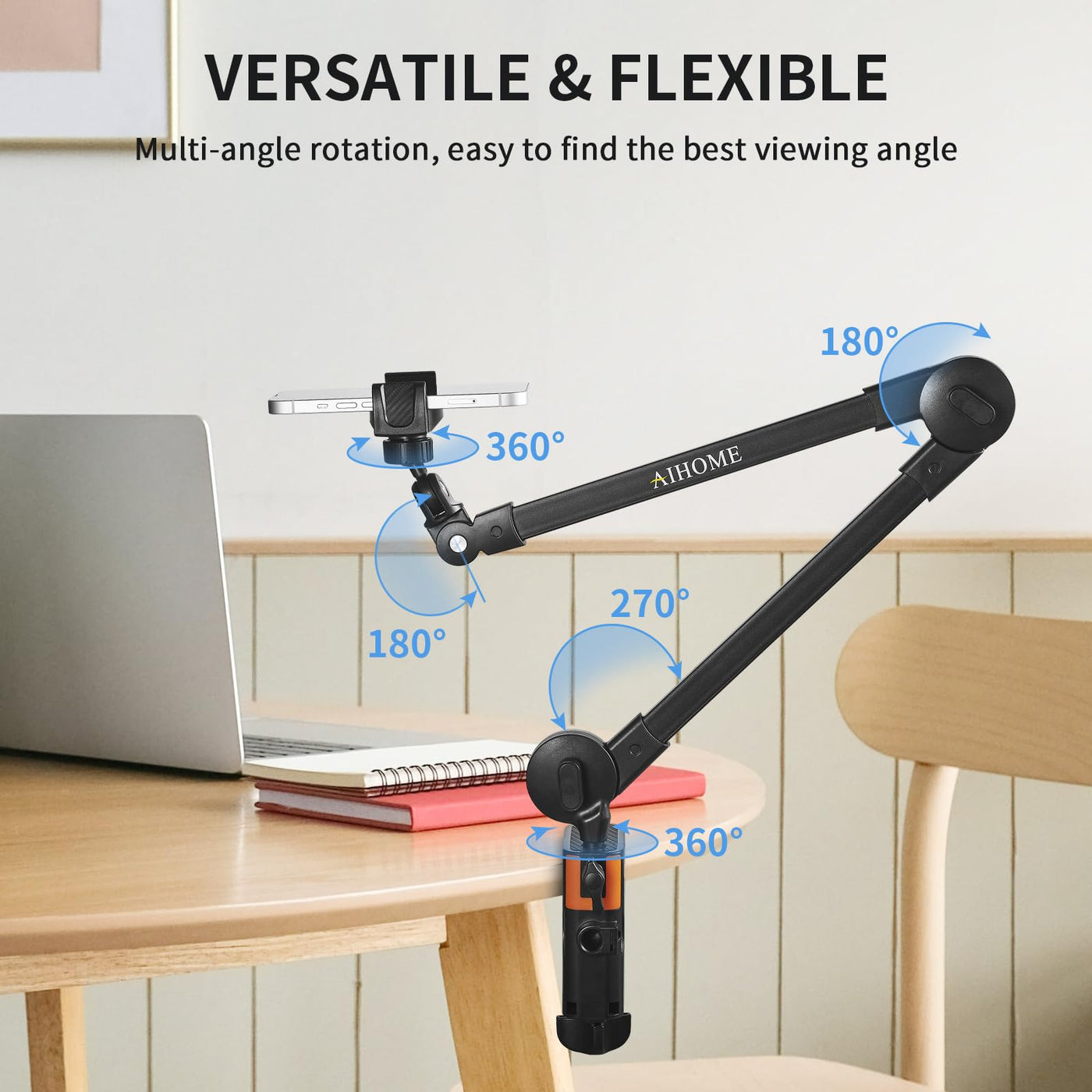 Aihome Articulating Desk Arm Phone Stand - A Must-Have Phone Holder Mount For Anyone 360 Rotation Universal Lazy Phone Holder - Ergonomically Adjustable Angle Design Helps To Correct Your Posture So As To Not Only Protect Eyesight But Also Reduce The Risk Of Cervical Spondylosis. Universal Compatibility - Compatible With 3.56.5 Inch Or Other Devices, Including Iphone, Samsung Galaxy, Sony, Motorola, Nokia, Huawei, Htc, Lg, Etc. Perfect For Recording And Viewing -- Allows You To Mount It To The Bed Headboard, Bedside, Desk, Or Table Next To Your Favorite Chair Firmly. A Perfect Partner To Free Your Hands While Having A Facetime Call, Online Zoom Meeting, Watching Netflix, And Reading With Phone. Wireless Bluetooth Remote Control Distance Up To 33 Feet/10 M, Easy To Take Selfies, Group Shots, And Hands-Free Stable Shooting. Package:1*Articulating Arm, 1*Desk Clamp, 1*Phone Clip,1*Bluetooth Remote Shuttle Note: Cell Phone Not Included