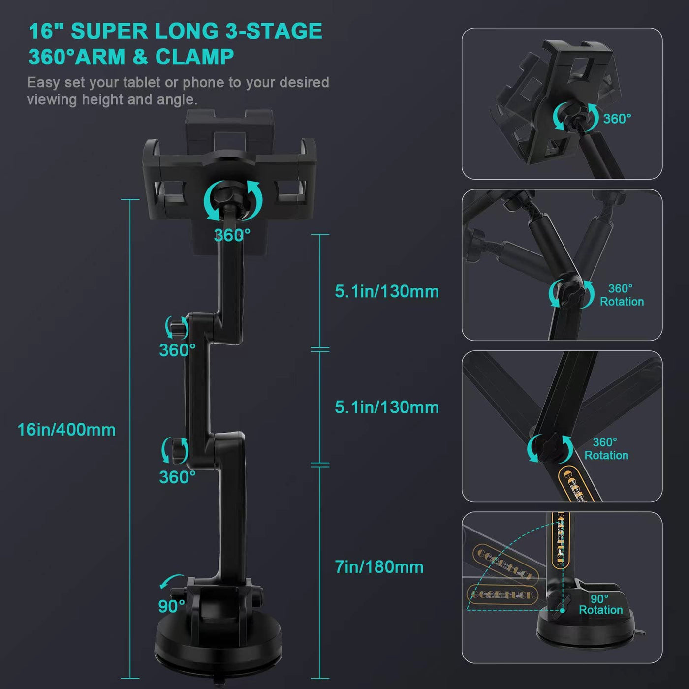 Porfortop Ipad Pro 12.9 Inch Tablet Mount, 4 Inch Suction Cup, 16 Inch Arm, Wide Compatibility, Full Protection, Hassle Free Cha