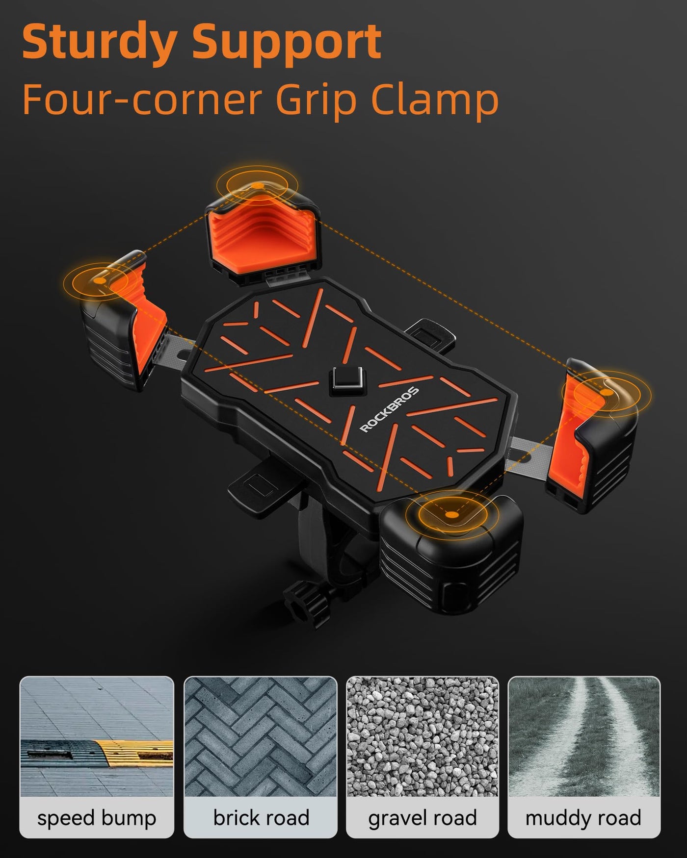 Products Name: Rockbros Motorcycle Bike Phone Holder Material: Abs+Pc Colour: Black Orange,Black Gray, Black Fits Type: Bike, Motorcycles, Ebike, Electric Scooter Etc ?One-Handed Operation?: Convenient One-Handed Operation For Easy Phone Placement While Cycling. ?1S Quick Release?: Auto-Locking Feature With A Quick-Release Button For Effortless Phone Attachment. ?Upgraded Handlebar Clamp?: Sturdy Clamp With Enhanced Grip And Vibration Resistance. ?Easy Installation?: Tool-Free Installation With Adjustable Silicone Pads For A Secure Fit. ?Wide Compatibility?: Fit A Wide Range Of Smartphones And Vehicles.