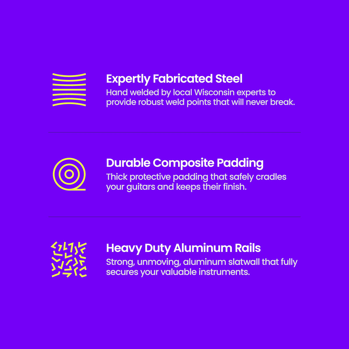 Guitars Are Unique, They Bring About An Air Of Style And Class. Their Sheer Look Is Captivating And Dynamic. So Why Leave Them Cluttered On The Floor Or Stashed Away In A Case? Complete Your Music Room/Studio And Showcase Your Beautiful Guitars With Our Guitar Wall Hanging System. This Practical Display Rack Offers Dynamic Angles, Fully Adjustable Spacing, And Pivots Up To 180 Degrees Left Or Right. It Can Be Used As An Acoustic, Electric, Or Bass Guitar Wall Mount. Trusted By Collectors And Guitar Shops Globally For Its Slick Aesthetic And Reliability. The Rack Is Built With A Heavy Duty Aluminum Rail For Optimal Care And Peace Of Mind. Handcrafted In The U.S.A, We Are Committed To Excellence In Every Build. Create The Perfect Atmosphere And Showcase Your Guitar Collection In Style. Our Guitar Wall Holder Will Protect And Cherish Your Instruments Like Never Before.