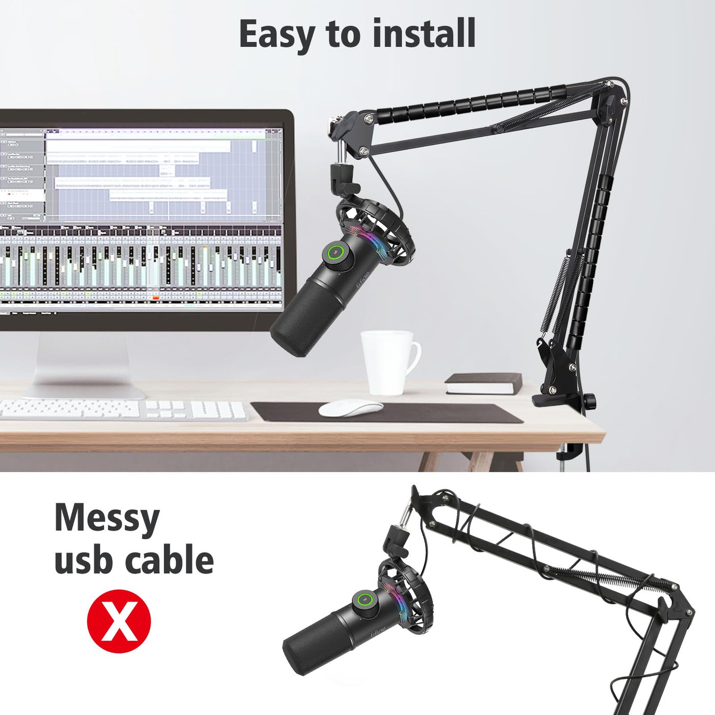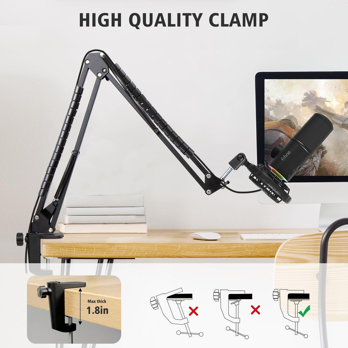 Do You Still Have Your Hands Tied When Using The Microphone? Is Your Workspace Occupied By A Microphone Stand? Come And Buy Our All-In-One Mic Stand Set! Free Your Hands And Increase Your Working Space. Fifine K658 Boom Arm Is Also Easy To Install And Easy To Use. And Flexible, You Can Easily Move Mic Arm To Adjust The Fifine Mic Whenever Needed And Have It In Just The Right Place To Show Your Perfect Voice. Heavy-Duty Solid Strong Durable Iron Clip Base Provides A Sturdy And Reliable Way To Hold Your Microphone Arm Stand. Soft Silicone Padding Protection At The Contact Point With Table Considerately Protects Your Desktop Surface From Any Scratches. Longer Service Life Than Other Mic Stand Clips Foam Pads. Our Mic Stand Has Good Stability And Strong Bearing Capacity. What Are You Waiting For? Take It Home Quickly! Package Included 1 X K658 Mic Boom Arm Stand 1 X Table Mounting Clamp 2 X Cable Ties Note: No Not Included Fifinemicrophone