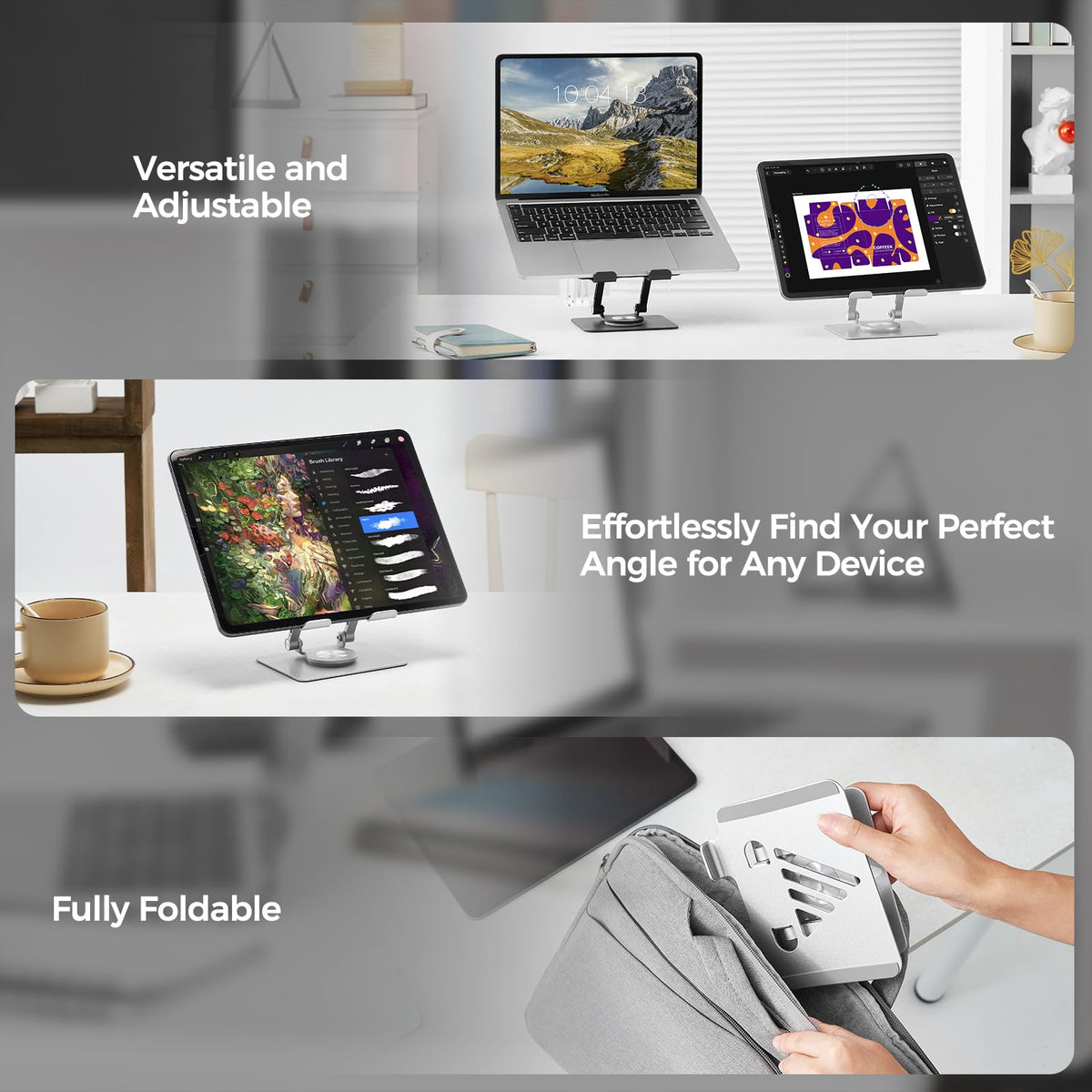Q: How does the 360° rotation feature work?A: The stand is equipped with an upgraded mechanism that allows for smooth 360° rotation. This design incorporates mechanical stops and a damping feature to provide a tactile and auditory experience, enhancing usability.