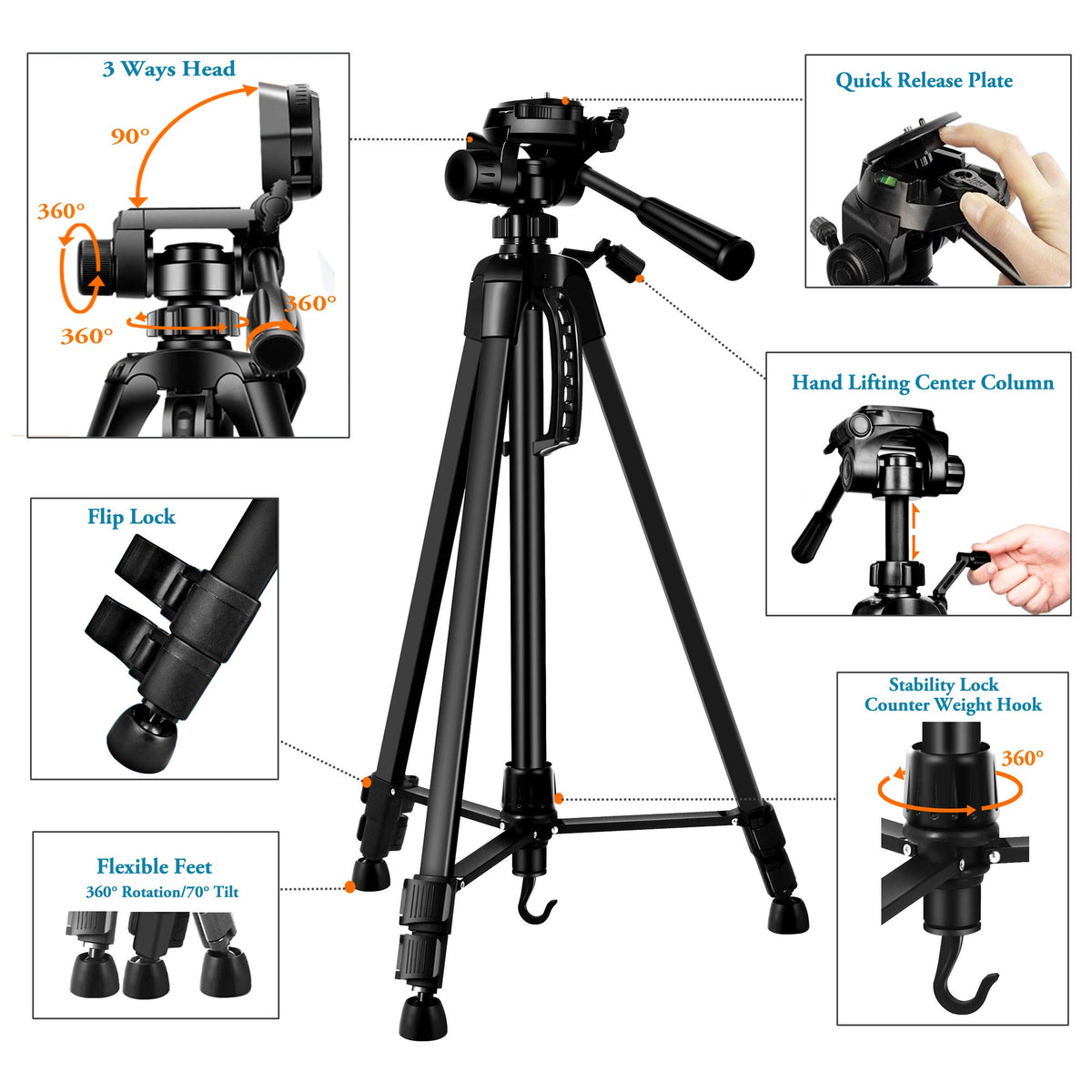 This Heavy Duty Ipad Tripod With Tablet Phone Holder Fit Most Ipad/ Tablet/Smartphone/Cameras. Perfect For Lectures, Classroom Presentations, Tournaments, Trips, Vlogging, Selfies, Portrait Or Landscape Photographing, Facebook Youtube Twitch Live Streaming, Facetime, Etc. Record Your Every Good Mome 1. Made Of Quality Al-Alloy, Solid And Sturable. 2. Lightweight & Portable Only 2Lb 3. Non-Slip Adjustable Rubber Feet Make It More Sturdy In Various Topography, Like Flat, Damp, Uneven Areas 4. Weight Hook, Hanging Extra Weight For Additional Stability 5. Be Equipped With Dual Bubble Level 6. Ipad Tripod Mount Made Of Abs, The Solid Structure, Not Wobble. 7. The Four Claws Of Tablet Clamp Use High Density Sponge Pad For More Friction, They Can Tightly Hold Your Tablet And Protect It From Scratch 8. Bluetooth 4.0 Remote, Works With Phones Tablets Within 10M/33Feet Effective Distance. Fast Response And Stable Connection Let You Record Crucial Life Moments Simply With Your Own Hands Tripod Stand Spec: Material: Aluminum Max. Load Capacity: 3 Kg/6.6 Lbs Weight: 2 Lbs / 0.98 G Tablet Phone Holder: Size: Extension L 23.5Cm(9.25In) X W 8Cm(3.14In) Weight: 115G Package: 1 X Camera Tripod Stand 1 X Ipad Tablet Mount 1 X Bluetooth Remote Shutter With Lanyard 1 X Carry Case 1 X User Manual Compatible With:(All Tablet From 3.5 To 13.5In) Ipad Pro 12.9 / 11 / 10.5 / 9.7, Ipad 10.5 / 9.7, Ipad Air 9.7, Ipad 3 4 5, Ipad Mini 3 4 5 Samsung Galaxy Tab, Surface Pro 7 6 5, Google Nexus 10 9 7, Nokia Pad, Sony Xperia Zenpad Lg Tabs Smartphone: Iphone 12 Pro / 11 / Xr / Xr Max / 10, Samsung Galaxy S21 S20 S10 S10+, Note 30 20 10+ 10 9 All Smartphone With Length More Than 12Cm(4.7In) Most Dslr, Slr, Sports Camera, Projector, Camcorders, Webcam, Scopes, Telescopes, Laser Levels And Binocular, Etc;