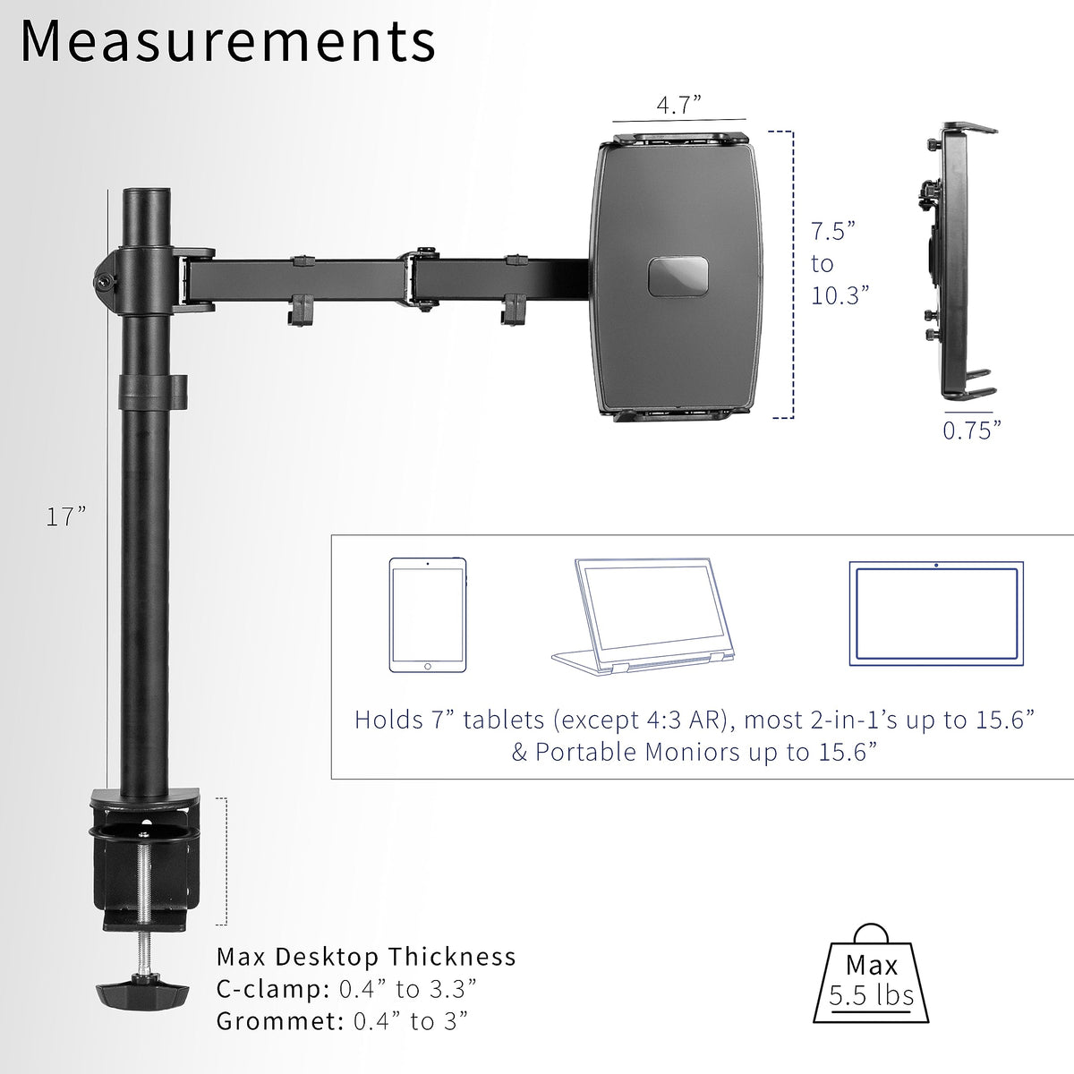 VIVO Universal Tablet Desk Mount, Single Arm Adapter for 2 in 1 Laptops, Holds up to 15.6 inch Portable Monitors Without VESA Holes, Fully Adjustable Stand, Black, STAND V001UVM